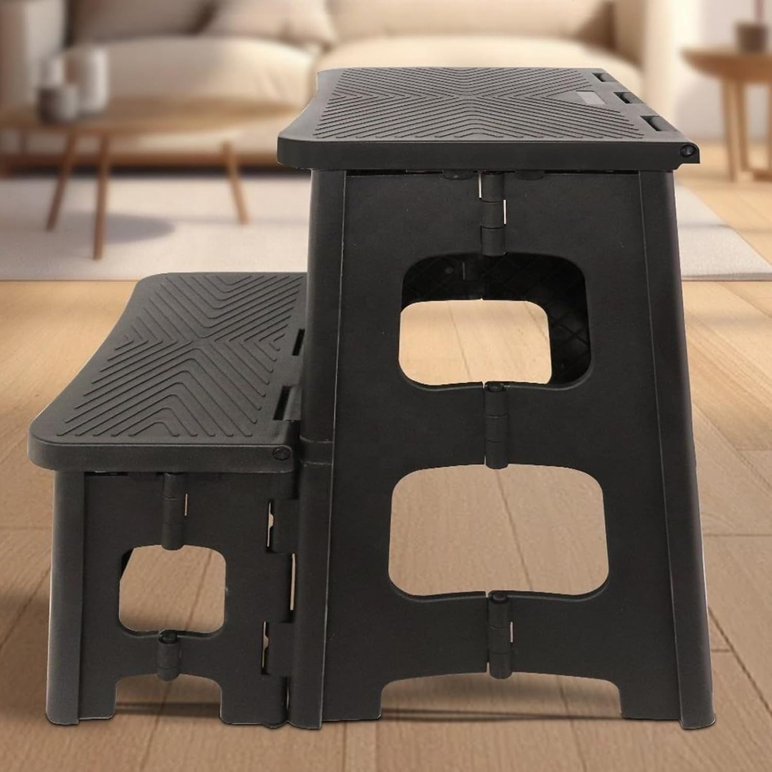 Attic stairs make previously inaccessible attic spaces readily accessible, greatly improving the utilization of the attic area. An ergonomically designed integrated reinforced handle that provides reliable support throughout the entire process.Specifications:Product Name: Double-Layer Folding StoolColor: BlackMaterial: ABS PlasticStool Dimensions: 367x320x420 mm / 14.4x12.6x16.5 inchesStep Height: 210 mm + 210 mm / 8.3 inches + 8.3 inchesFeatures:The double-tiered stool employs multiple interlocking connection points for mutual support, ensuring a stable platform to effortlessly tackle various tasks.Crafted from premium ABS material, it offers outstanding load-bearing capacity, long-lasting durability, and reliable performance.The anti-slip tread design effectively reduces the risk of accidental slips, providing a secure and stable foothold.The foldable structure facilitates easy ortability and storage, effortlessly meeting mobile usage needs while saving limited space.Ideal for reaching high items, cleaning windows, organizing closets, or assisting children with brushing teeth and handwashing.Notes:Manual measurements may have a 1-3 cm (0.4-1.18 inch) margin of error. Thank you for your understanding. Package Contents: 1*Folding Step StoolFixed attic stairs offer a more stable and safer way to go up and down, especially for situations requiring frequent movement or carrying of items.