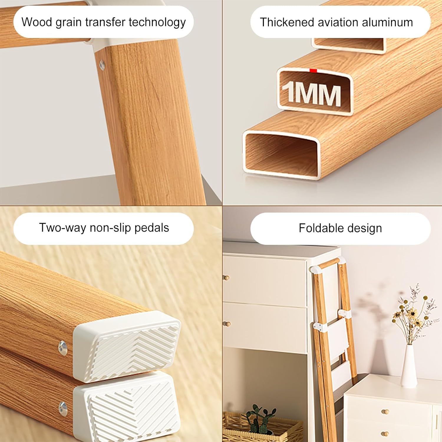 Our ladders are your go-to tools for indoor and outdoor tasks. Easily reach high shelves, handle cleaning chores or repair home appliances, prune branches; made of thickened aluminum alloy, smooth surface, reinforced welded frame for durability——Product advantages:1. The pedals are wide and have anti-slip stripes, and the bottom is equipped with rubber foot pads to increase friction, prevent sliding, and protect the floor from scratches2. The ladder can be quickly unfolded and folded for easy carrying and storage3. The handrails fit the hands naturally to ensure stability and balance when climbing4. The back is widened and thickened, with higher stability, so that every step you take is stable5. The widened pedal has a larger activity space, and the concave stripes are effective in preventing slipping6. The surface is anti-oxidation, not easy to lose paint and rust, and has a delicate and smooth touch——Product parameters:1. Product name: Ladder household folding ladder2. Product material: aluminum alloy3. Product color: log color4. Load-bearing capacity: 330 pounds (about 150 kilograms)5. Applicable scenarios: Suitable for a variety of occasions such as home maintenance, decoration, outdoor activities, etc.6. Packing list: folding ladder * 1