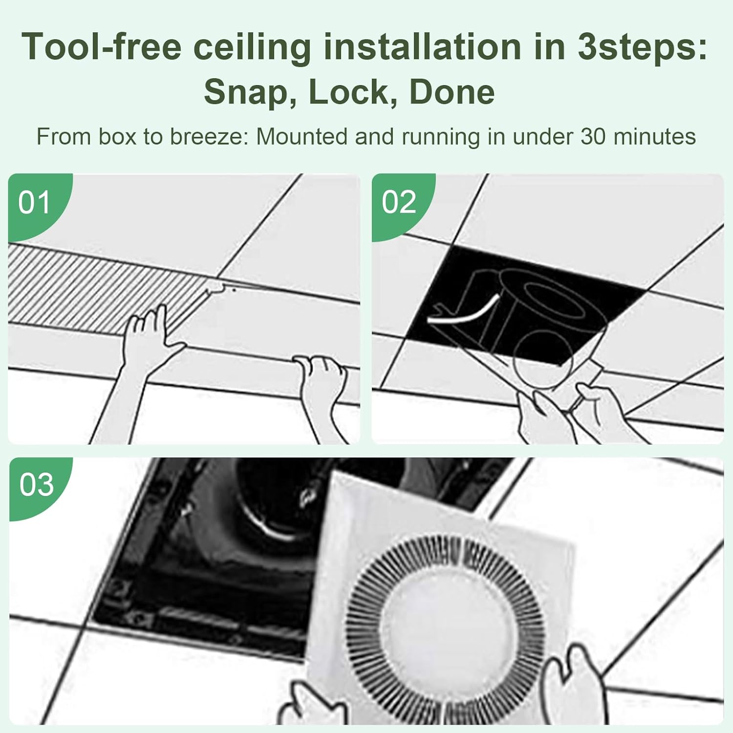 • 【Quick and Easy Installation】The bathroom ceiling exhaust fan is suitable for 30*30cm (11.8"*11.8") ceiling openings and comes with a quick bracket. Simply use the quick bracket to install the bathroom ventilation fan between the ceiling joists, replacing existing products without entering the attic, making subsequent cleanup easier.