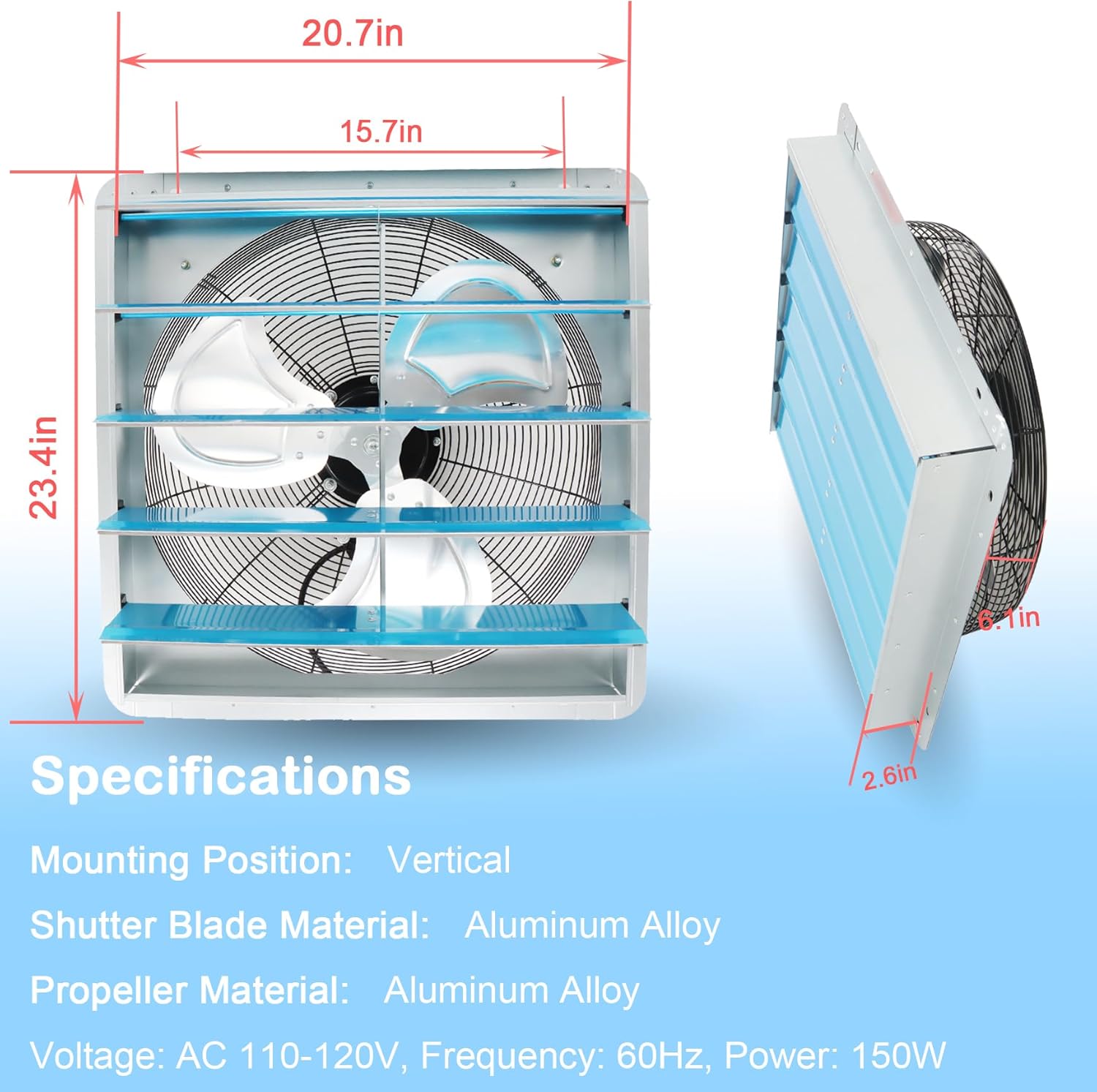 SpecificationsColor: SilverSpeed: 3368 CFMGrille diameter: 23.4 inchShutter size: 20.7 inchx20.7 inchInstall-able thickness: 8.7 inchVoltage: Alternating current 110-120VFrequency: 60HzPower: 150WWarm tipsDue to different monitors, there may be subtle differences in colors.There may be errors in manual measurement.The accessories contained in the product are subject to the picture.