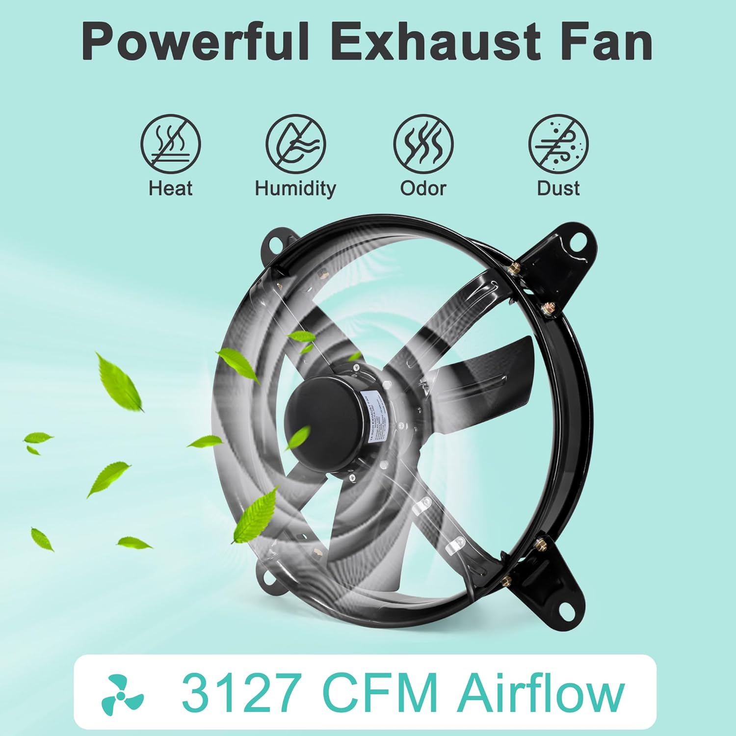 3127 CFM (cubic feet per minute) powerful gable mount attic fan Cools up to 1,850 square feet Keep your attic cool and ventilated with the high power gable ventilator fan.Specification:Volts: 115 VFrequency: 60 HzAirflow Rate: 3127 CFMSpeed: 1080 RPMPower: 148 Watts20 inch exhaust fan with thermostat can be widely used as attic fan, greenhouse fan, shop fan, garage fan, chicken coop fan for ventilation