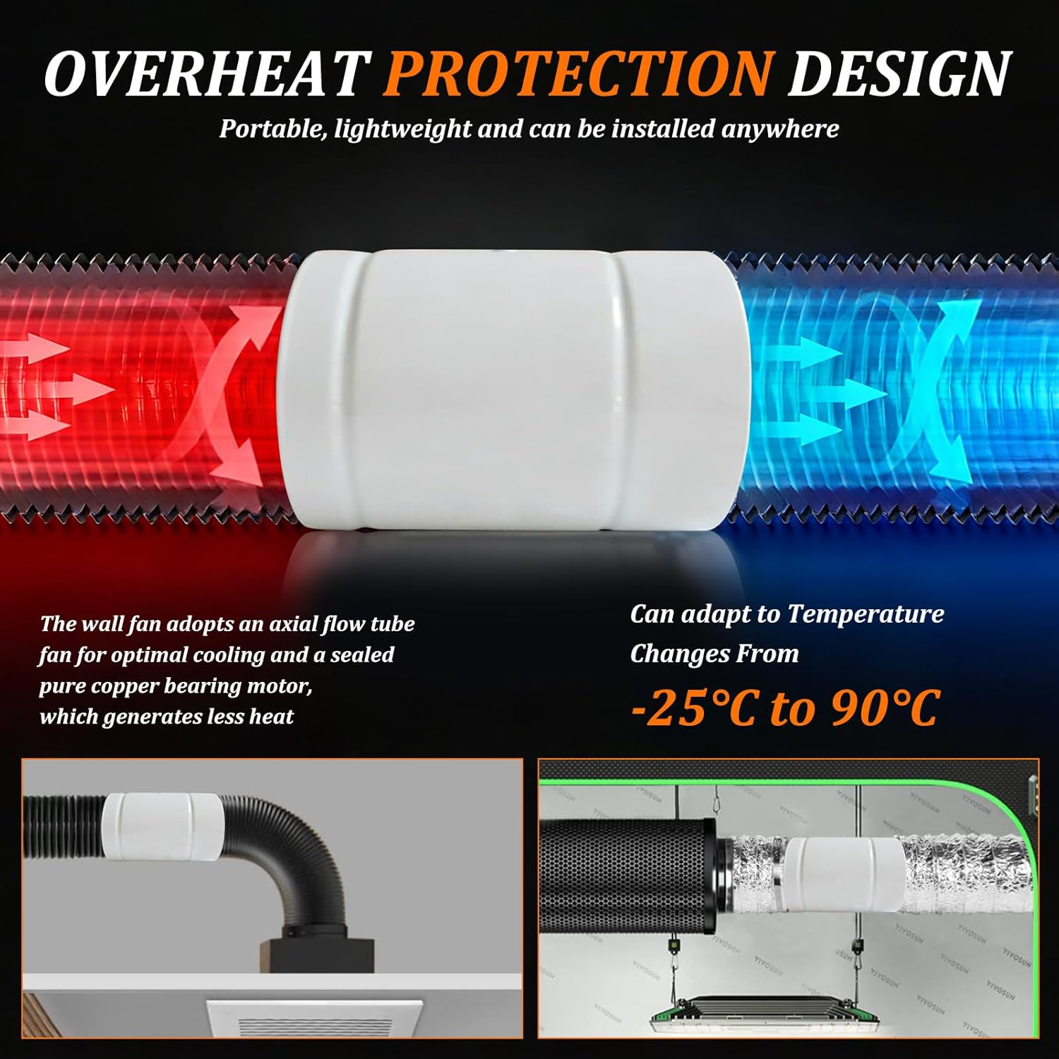 Transform your bathroom exhaust fan system with the CMFTGDS Inline Booster Duct Fan—a high-performance solution engineered to eliminate moisture, odors, and stale air. Whether you're upgrading existing ventilation or handling duct fan installation, this professional-grade fan delivers exceptional results in residential and commercial applications.SPECIFICATIONSSize Options:1. 8 Inch: 765 CFM | 80W | <62dB | 140 Pa Pressure2. 10 Inch: 1,240 CFM | 100W | <65dB | 215 Pa Pressure3. 12 Inch: 1,765 CFM | 120W | <68dB | 230 Pa PressureTechnical Details:1. Voltage: 110V AC | 60Hz Frequency2. Available Colors: Black or White3. Motor Speed: 2,800 RPM4. Material: Aluminum and steel construction for durabilityPACKAGE INCLUDES1. One Inline Booster Duct Fan (size selected)BEFORE INSTALLATION1. Verify ductwork diameter matches your selected fan size for maximum airflow efficiency.2. Professional duct fan installation is recommended to ensure proper setup and safety compliance.3. Ensure all ductwork is properly sealed to prevent air leaks and maximize performance.MAINTENANCE RECOMMENDATIONS1. Clean intake grilles quarterly to maintain optimal airflow and performance.2. Inspect electrical connections annually for security and integrity.3. Keep the motor area dry and free from dust or debris during operation.IMPORTANT SAFETY INFORMATION1. Turn off electrical power at the breaker before any maintenance, cleaning, or installation work.2. Do not operate without properly connected ducting to prevent motor damage or overheating.3. Verify all electrical connections are secure and follow local electrical codes.