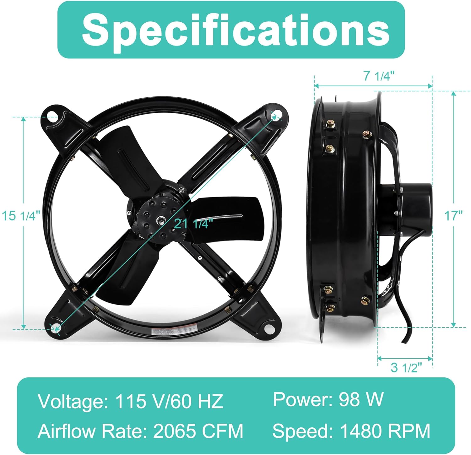 2050 CFM (cubic feet per minute) heavy-duty gable mount attic fan Cools up to 1,850 square feet Keep your attic cool and ventilated with the high power gable ventilator fan.Specification:Volts: 120 VFrequency: 60 HzAirflow Rate: 2050 CFMSpeed: 1480 RPMPower: 98 Watts16 inch exhaust fan with thermostat can be widely used as attic fan, greenhouse fan, shop fan, garage fan, chicken coop fan for ventilation