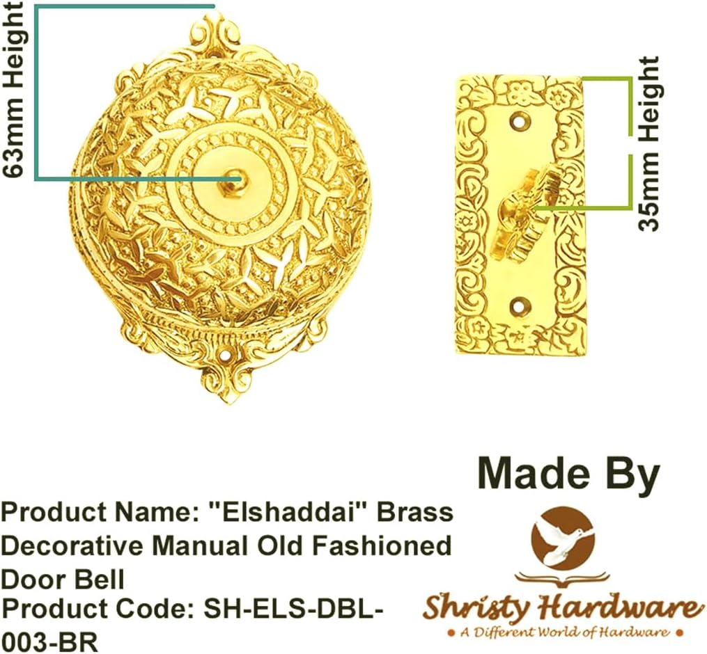 "Elshaddai" Brass Manual Old Fashioned Door Bell is created out of high quality Solid Brass material. Our exclusive Polished Lacquered Finish makes it stay for many years to come. It can be the very key in bringing your home design altogether. Door Bell is best solution to add quality and style on your main door and Antique look you’re your Front Door. Mount this door Bell on your front door and change the look of your door immediately! No more boring wireless doorbell and Impress your guests with the antique look of this decorative doorbell chime with this Door Bell. It is creatively crafted from Brass for a sturdy, long lasting Brass Door Bell. The product structure is simple and suitable for various Exterior or interior decorations, such as living rooms, study rooms, bedrooms, etc…HANDMADE HOUSE DOOR BELL BY SHRISTY HARDWARE:The strength of Solid Brass material together with the Polished Lacquered finish makes this Door Vintage Door Bell sturdy and durable. It looks beautiful on fixed on your entrance, bedroom or office door in no time this knocker can be a decorative at the main door or gate of your house!WE SURE 100% CUSTOMER SATISFACTION GUARANTEE!Don’t Hesitate! ORDER NOW to receive our Decorative Brass Door Bell and decorates your home!