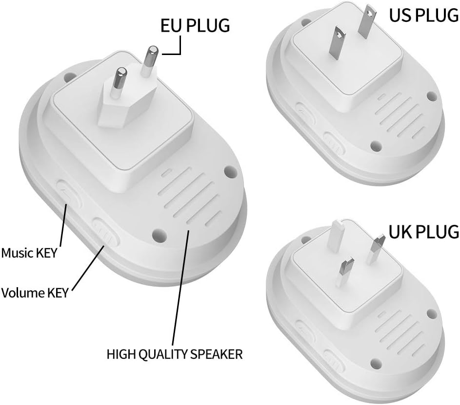Press the button, super learning code can freely learn to match, can be unlimited matching receiver. The transmitter has no screw chuck design, and it can be waterproof and dusoof without rubber ring. If multiple buttons are paired with or more receivers in the same system, each button can be set to a different ringtone. Power-off memory function: Turn the power on again after power off, no need to re-adjust and lock the ringtone. The receiver is available in a variety of plugs, US/EU/UK Plug and AU adapters, suitable for most countries. Eye-catching backlight flashes when someone pushes the doorbell. Particularly suitable for the elderly, deaf, and pregnant women. The receiver voltage is 220v. The receiver is a distance of 300 meters (in an opening area), which may be affected by the environment and obstacles. The receiver has 58 ringtones to choose from, and the volume is 20-110db in 4 levels. The receivers has US, EU, UK Plug and AU adapter, if you want US,EU plug or AU adapter, please leave a message. Just plug the receiver into an electrical outlet,the push button transmitter can be stick it to the door with provided adhesive tapes. Note: The button cannot be placed on an iron door because it will interfere with the signal.
