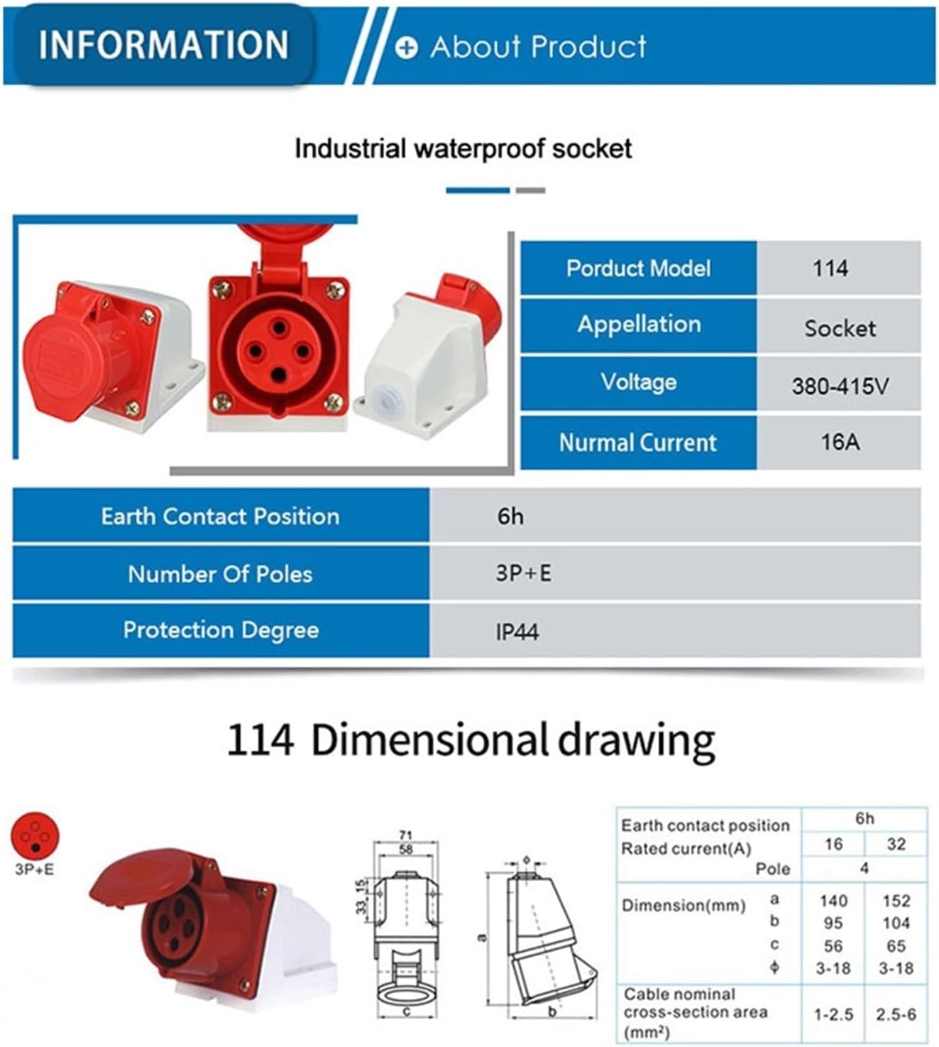 Electrical Connectors1PCS IP44 Industrial & Sockets Waterproof Cable Wire Connector Electrical Power Conditioning Male Female 16A 380V-415V==========Model Number : 014/114/214/314Voltage : 220 V