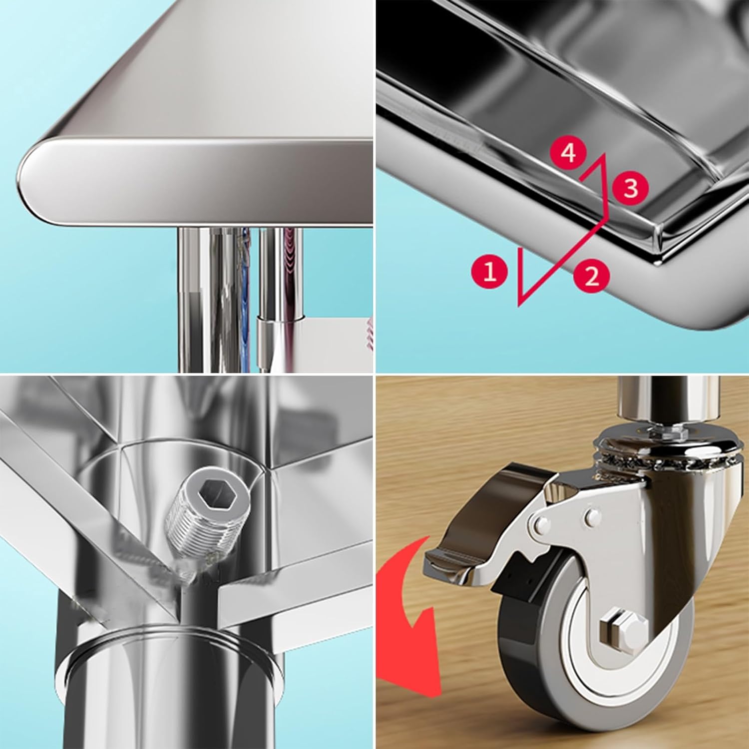 Brakeable universal wheels, wheels can swivel, flexible movement, brake pad design, 1 step to stop, more convenient to useThese commercial workbenches and workstations are made of stainless steel, not easy to deform, can be use for a long time. Not afraid of heavy objects, thicker and thickened high load easily handle heavy objectsProduct Name:Three-deck workbench with wheelsMaterial: stainless steelSize:76*61*89centimeters(29.9*24*35")91*61*89centimeters(35.8*24*35")Product list: workbench x1 (other items not included)Attention Tip:Please note that there may be a little color difference due to different screen displayManual measurement, there may be 1-3 centimeters error, please understandDue to the stainless steel products, there may be slight welding spots and scratches, please understand