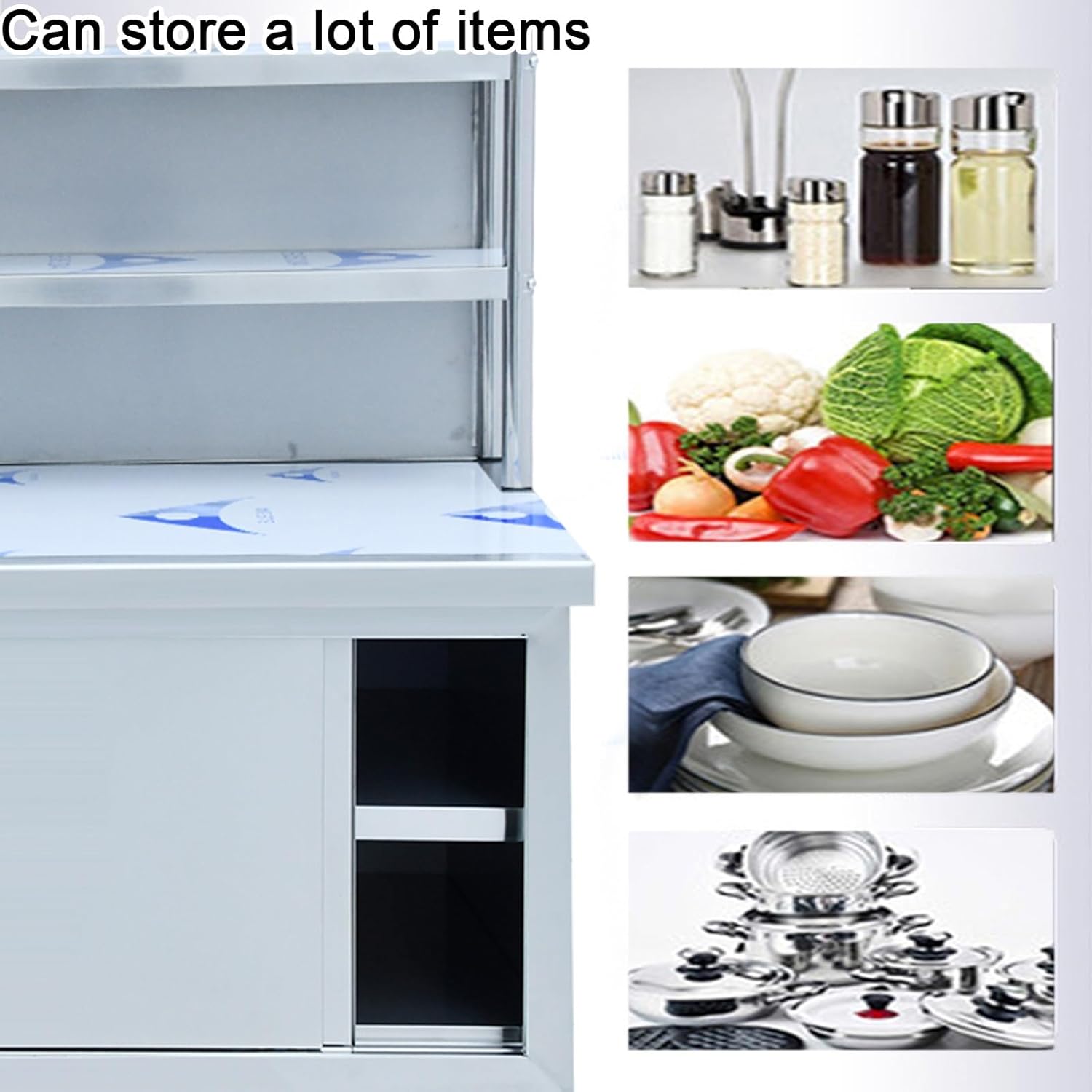Name: WorkbenchMaterial: Stainless SteelColor: SilverContents Include: Workbench x1 (excludes other items shown in image)Dimensions:80x50x80cm (31.5x19.7x31.5") 80x60x80cm (31.5x23.6x31.5") 100x50x80cm (39.4x19.7x31.5") 100x60x80cm (39.4x23.6x31.5") Applications: Suitable for kitchens, ramen shops, restaurants, hotels, back kitchens, warehouses, workshops, balconies. Offers ample storage space for various items.Features:1. Upper tier features a vertical rack design, while the lower tier incorporates sliding doors, enabling simultaneous work and storage. The countertop includes three-sided backsplashes with a closed rear design to prevently items from falling.2. Sliding door design with two handles per door, allowing bidirectional. Dual-track system ensures smooth, snag-free gliding.3. Constructed from fire-resistant, stainless steel. Smooth surfaces facilitates easy cleaning, ensuring durability and high load-bearing capacitility.4. Ample storage space: Upper rack stores condiments, tableware, Large-capacity sliding door compartment accommodates microwaves, ovens, and other appliances for convenient use.Important Notes:1. Dimensions are measured manually and may vary slightly. Colors may appear different due to shooting angles or lighting conditions.2. As this product is made of stainless steel, minor scratches may be present on the surfaces but do not affect functionality.