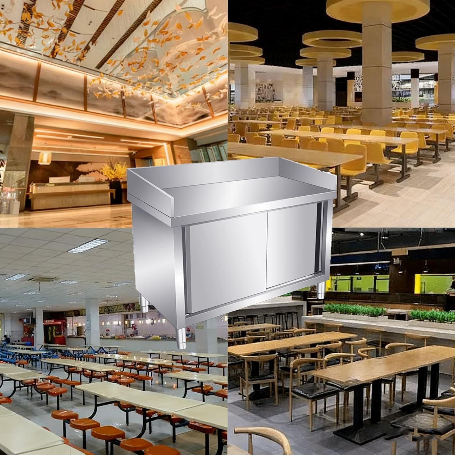 Product Name: Stainless Steel Countertop Product Material: Thickened 304 Stainless Steel Product Craftsmanship: Brushed Craftsmanship Product Size: 80x40x80cm/31.5x15.7x31.5“ , 80x50x80cm/31.5x19.7x31.5” , 80x60x80cm/31.5 x23.6x31.5“ , 100x50x80cm/39.4x19.7x31.5” , 100x60x80cm/39.4x23.6x31.5" , 100x70x80cm/39.4x27.6x31.5 “ , 100x80x80cm/39.4x31.5x31.5” Main Functions:Shelf/Packing Scope of Application:Hotels, canteens, factories, suitable for noodle making, cutting vegetables, and as an operating table.Three-side enclosure Avoid falling objects and leakage of ingredients, water proof and oil-proof.Adjustable feet, easy to adapt to different floorsSliding door non-dislodgement design Sliding door design, smooth pushing and pulling, convenient and no hand pinching.Product list: worktable x1 (other items not included)Attention: Stainless steel products are welded, there will be slight welding points The product is made of stainless steel, there may be slight scratches Dimensions are hand-measured and may vary slightly Due to the shooting angle, monitor and resolution, the image may have a slight color difference
