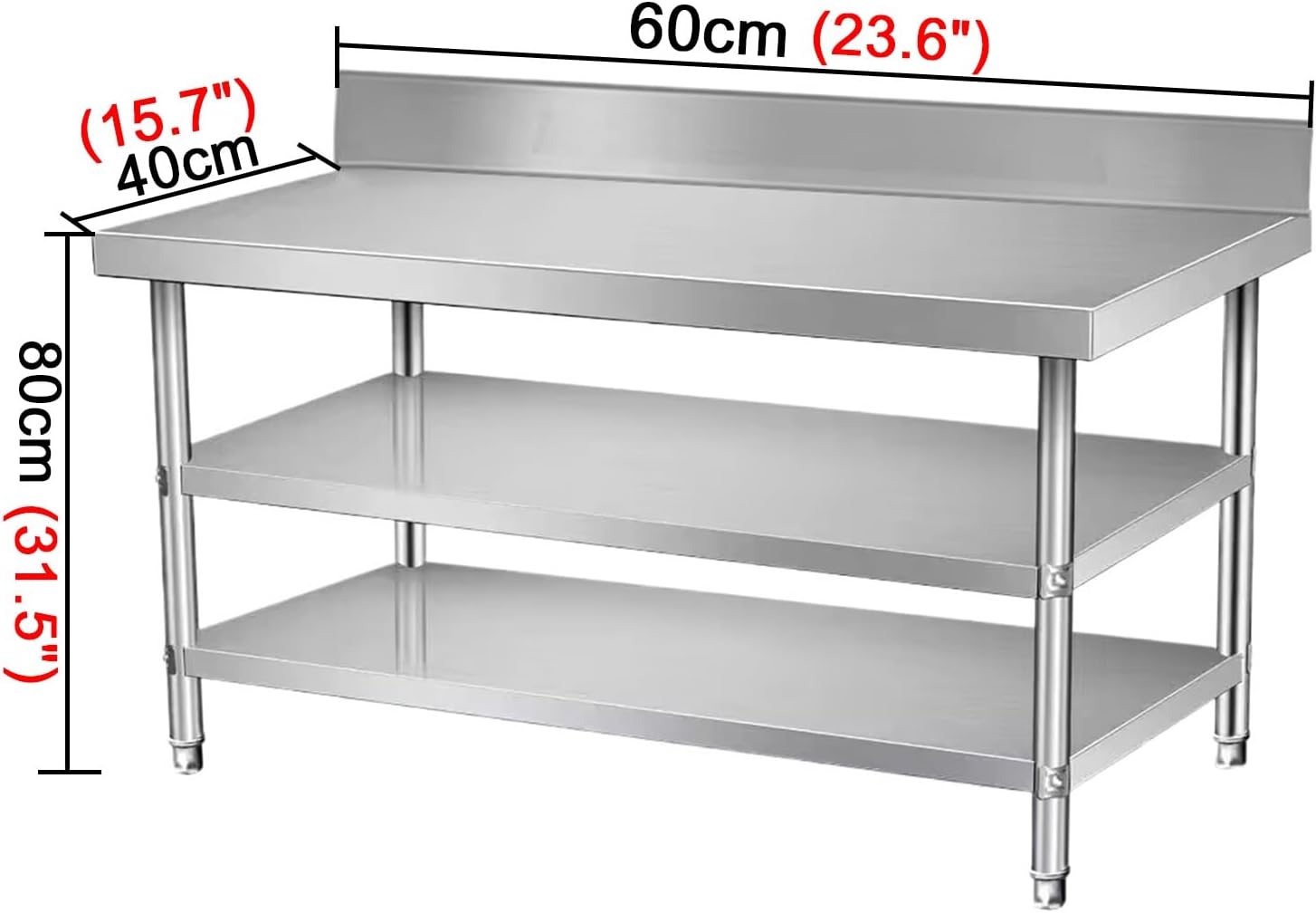 Name: WorkbenchMaterial: Stainless SteelColor: SilverContents Include: Workbench x1 (excludes other items shown in image)Dimensions:60x40x80cm (23.6x15.7x31.5")80x60x80cm (31.5x23.6x31.5") 90x60x80cm (35.4x23.6x31.5")100x60x80cm (39.4x23.6x31.5")120x60x80cm (47.2x23.6x31.5")120x50x80cm (47.2x19.7x31.5")80x50x80cm (31.5x19.7x31.5")80x80x80cm (31.5x31.5x31.5") 90x50x80cm (35.4x19.7x31.5")100x50x80cm (39.4x19.7x31.5")80x40x80cm (31.5x15.7x31.5") 100x40x80cm (39.4x15.7x31.5")120x40x80cm (47.2x15.7x31.5")120x80x80cm (47.2x31.5x31.5")Features:1. Three-tier design with built-in guardrails on the worktop to prevently items from falling during, avoiding accidents and unnecessary losses.2. Cross-beam reinforcement beneath the tabletop enhances load-bearing capacitility. Three reinforced columns provide stability, while triangular bracing between tabletop and columns ensures wobble-free.3. Adjustable leveling feet adapt to floor height for optimal balance. slip design prevents scratches on surfaces.Versatile Applications: Suitable for kitchens, schools, factories, workshops, warehouses, food stalls, living rooms, balconies, and more. Stable and wobble-free, accommodates various items.Important Notes:1. Dimensions are measured manually and may vary slightly. Colors may appear different due to shooting angles or lighting conditions.2. Stainless steel surfaces may show minor scratches, which do not affect functionality.