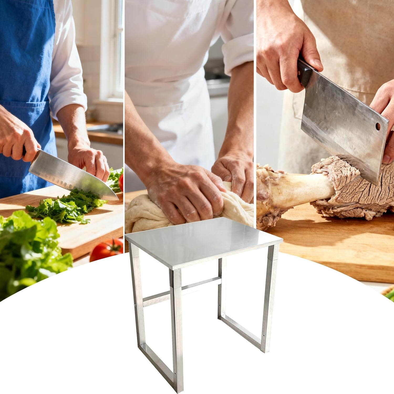 Made of stainless steel, smooth and flat, stylish and beautiful.Thickened table legs, double stability, stable support.Brushed finish, high-density, not easy to penetrate, easy to clean.Screw reinforcement, hardware screws, back reinforcement ribsnon-slip foot pads, quiet and wear-resistant, non-slip, water proof, stable and not easy to shake, silent movement.Product Name: Multifunctional WorkbenchMaterial: Stainless SteelDimensions:50x35x70cm / 19.7x13.8x27.6”, 60x40x70cm / 23.6x15.7x27.6”, 60x45x70cm / 23.6x17.7x27.6”, 80x40x70cm / 31.5x15.7x27.6”, 80x45x70cm / 31.5x17.7x27.6”, 100x50x70cm / 39.4x19.7x27.6”, 100x55x70cm / 39.4x21.7x27.6”Usage: Kitchen, garage, workshop, restaurant, laundry room, school, warehouseProduct Includes: Workbench x 1Important Notes:Due to manufacturing processes, stainless steel products may have slight welding marks.The stainless steel Countertop may have minor Countertop scratches.All dimensions are manually measured and may vary slightly.Due to angles, and resolution differences, images may show slight color variations.