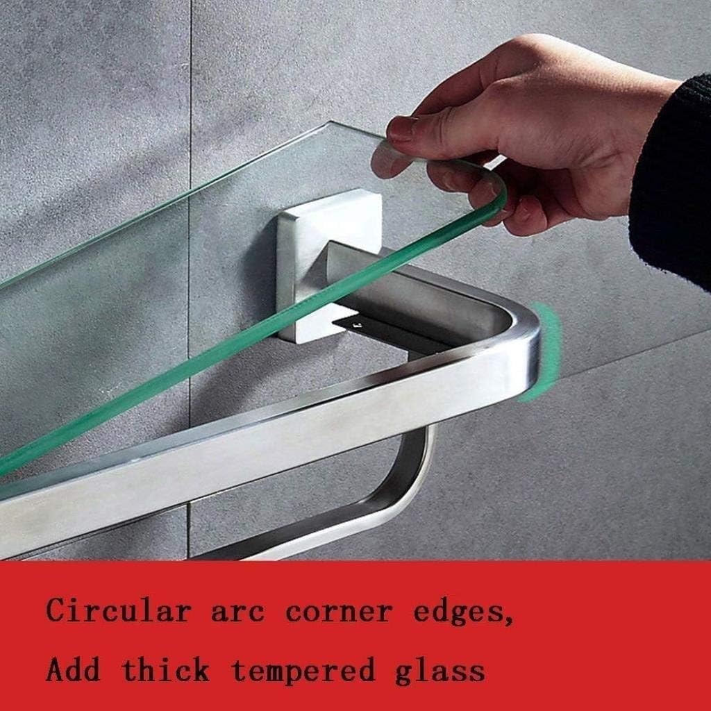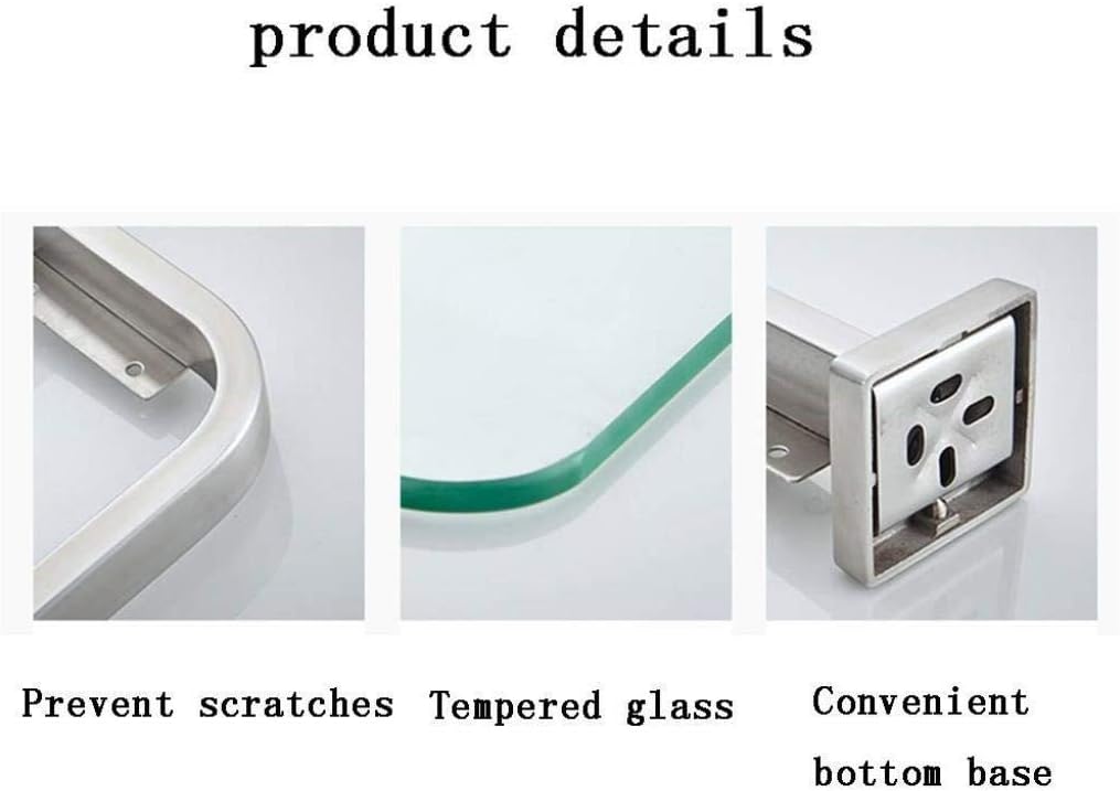 bathroom shelfSolid aluminum construction, Modern look, makes the bathroom Shelf suitable to use in bathroom and kitchenThe is a great solution for your kitchen or bathroom storage. It provides a chic space for your wash supplies and keep them in order at the same time.Product Name: Glass shelf bathroomProduct material: stainless steel + glassSurface technology: wire drawing processNumber of floors: 2Features: strong bearing capacity, anti-corrosion and rust resistanceInstallation method: punching / punchingProduct size: 40.5×14.5CM/15.9''×5.7'', 50.5×14.5CM/19.8''×5.7'', 60.5×14.5CM/23.8''×5.7''Glass shelf for the scene: daily, kitchen, bathroom, hotelGlass shelf maintenance method: regularly clean the surface of the productGlass shelf nail-free installation steps:1. Draw a mark at the installation location2. Loosen the screw with a hexagon socket wrench3. After removing the installation of the round cover, it is not easy to dispense too much on the back.4. After 1 minute, the glue will fully overflow and the wall will be attached to the seamless state.5. Wait 72 hours, the glue solidifies6. Align the towel bar with the mounting cover to complete the installation.Glass shelf punching installation steps:1. Mark the installation location to punch2. Installation degree base3. Insert the expansion tube4. Screw fixing base5. Install the main body and tighten the screwsEasy to install and Easy clean.Use the shelf to store shampoo, cleaning supplies and other items.Maximize your bathroom's storage space.