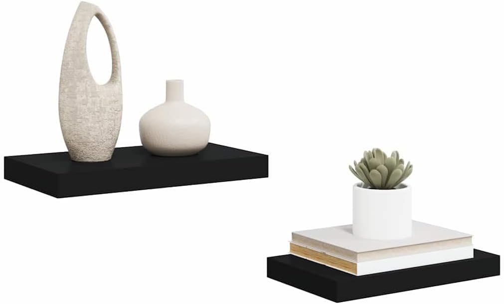 This Floating Wall Shelves set gives you two sleek shelves that not only jazz up your decor but also offer handy storage. Made from top-quality MDF, these shelves fit right into your home, enhancing the look of your living room, bedroom, or hallway while saving precious floor space.Elegant Design: The minimalist design of the floating shelves creates an illusion of space, making your room appear more open and inviting while allowing you to showcase your stylish items effortlessly.Easy Installation: Each shelf comes with wall mounting hardware for quick and hassle-free installation, ensuring you can have your new decor up in no time.Sturdy Support: These shelves can hold up to 11 lbs, making them an ideal platform for books, decorative pieces, or awards, providing both functionality and aesthetic charm.Indoor Use: Specifically designed for indoor environments, these shelves complement various decor styles while organizing your space, making them perfect for home or office.Quality Material: Made from durable MDF, these shelves will withstand regular use while providing reliable support for your items.Number Of Items: 2Color: BlackShape: RectangularMaterial: Wood MDFFinish: MatteIndoor/Outdoor: Indoor OnlyCover Included: NoRoom: Living RoomMaximum Weit: 11 lbsMounting Included: YesDimensions: 9.1 x 15.7 x 1.5 in (W x L x H)Weight: 4.63 lbsLadder: NoDelivery Contains: 2 x Wall shelfAssembly Required: YesRecommended Number of People for Assembly: 1