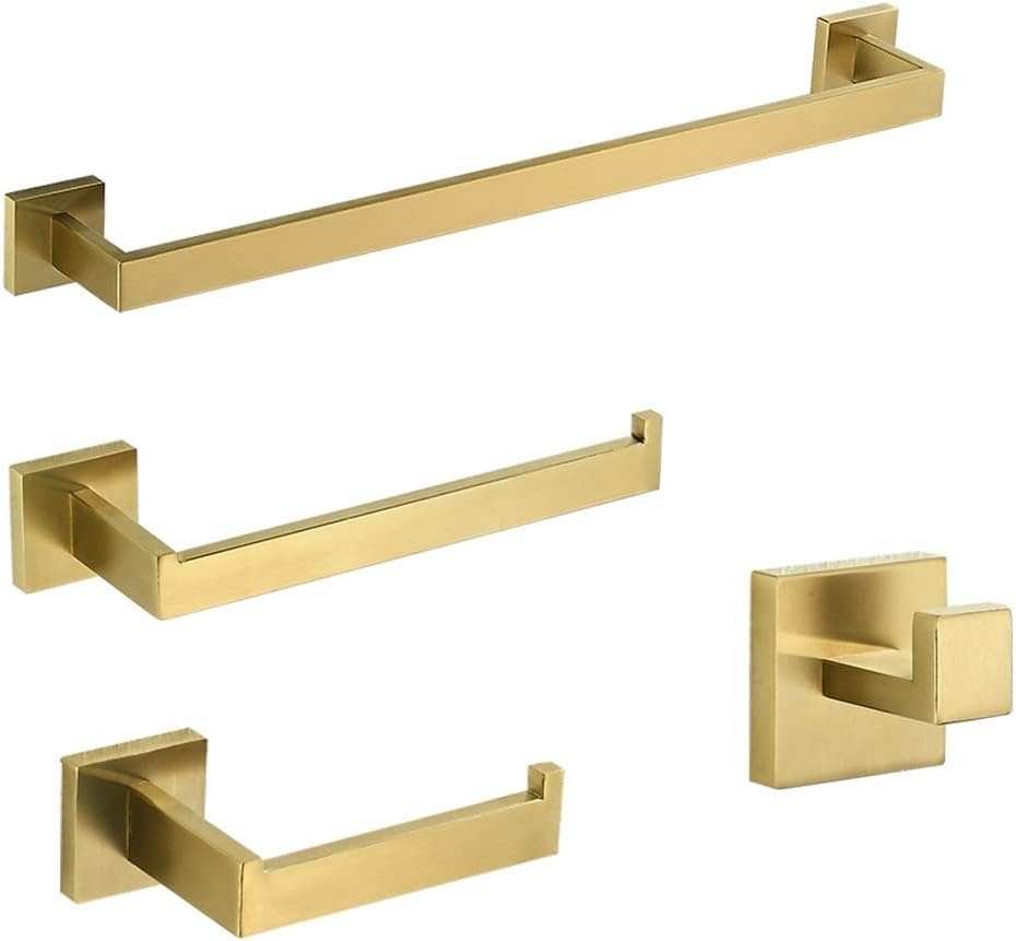 Brushed Gold Bathroom Hardware Set, Robe Hook, Towel Rail Bar Rack Shelf, Tissue Paper Holder, Bathroom Accessories>>Usage: Bathroom / Shower Room / Restroom / Toilet / Lavatory>Color: Brushed Gold>Type: Bathroom Accessories>Installation: Wall Mounted>Including All Installation Fittings>>Note: >1. Light shooting and different displays may cause the color of the item in the picture a little different from the real thing. >2. The measurement allowed error is +/- 1-3cm.{/p}