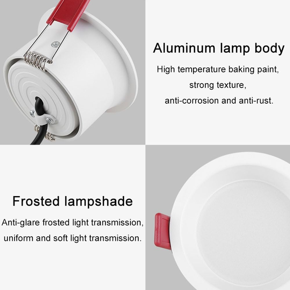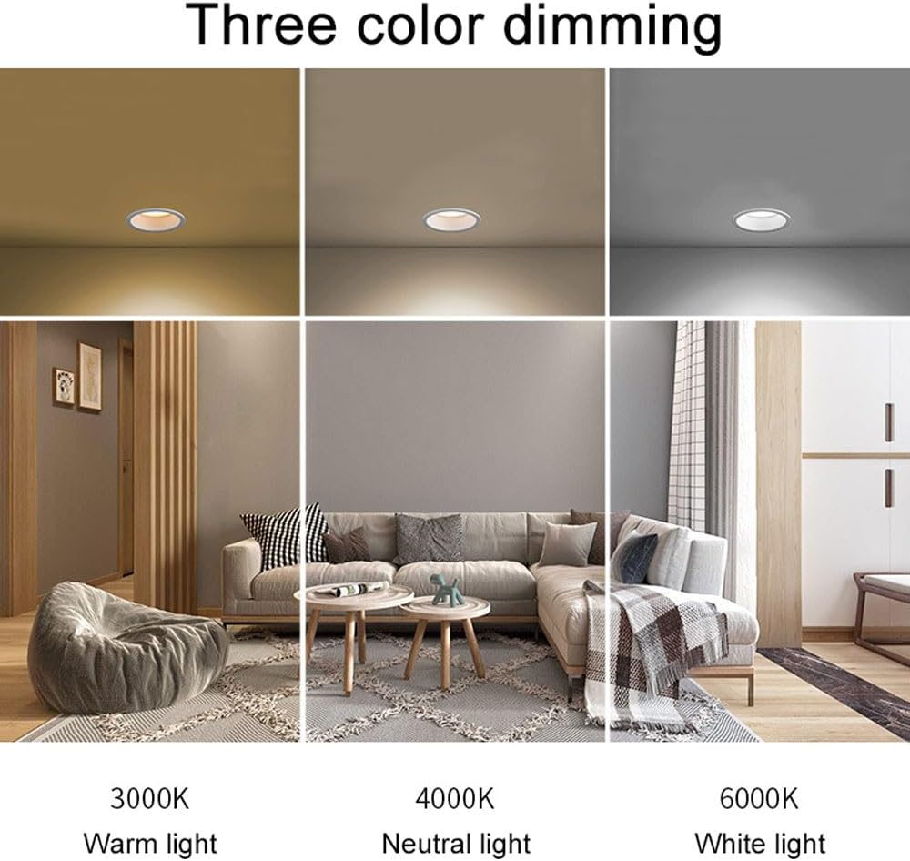 Specification:Type: DownlightMaterial: AluminumProduct color: WhitePower: 6 W6 W, surface diameter 85 mm, height 50 mm, opening size: 75 mmLight color: Three color dimmingColor rendering: high color rendering Ra > 90Input Voltage: 85 - 260 V ACLife Span: 50000 hoursInstallation: Embedded installationPackage included:Downlight*9