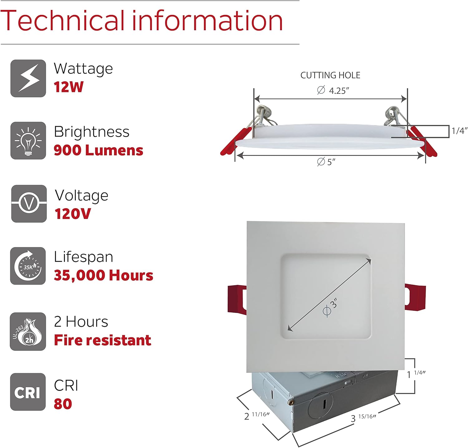 | Item Type Name | Nadair 6-pack 4 inches Square LED Ultra Slim Recessed Lights, 12W, 900 Lumens, 5CCT Color Selectable ( 2,7K/ 3K / 3,5K / 4K / 5K), White and Black Trim Included, Dimmable, IC Rated, ETL Certified |
