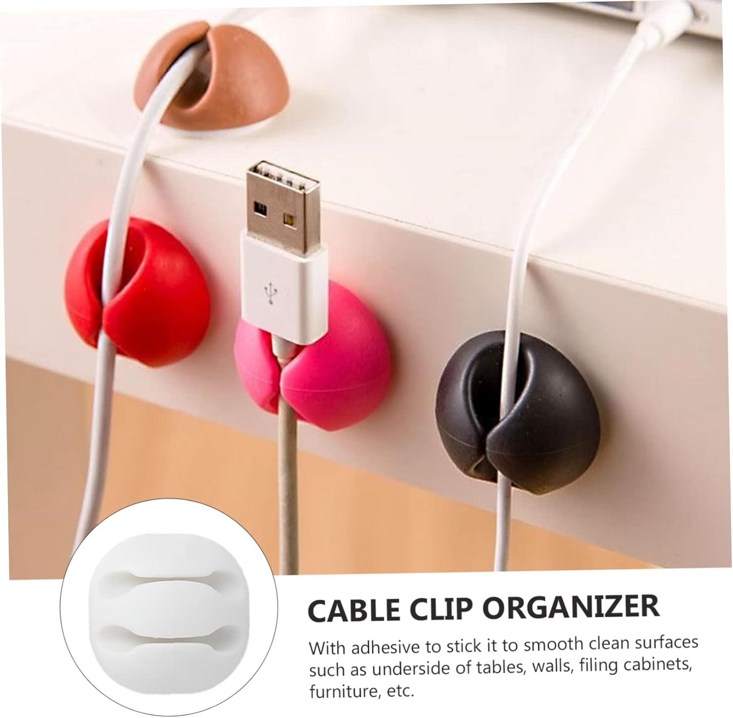 • Cable clip organizer:with adhesive to stick it to smooth clean surfaces such as underside of tables, walls, filing cabinets, furniture, etc,wire clip organizer