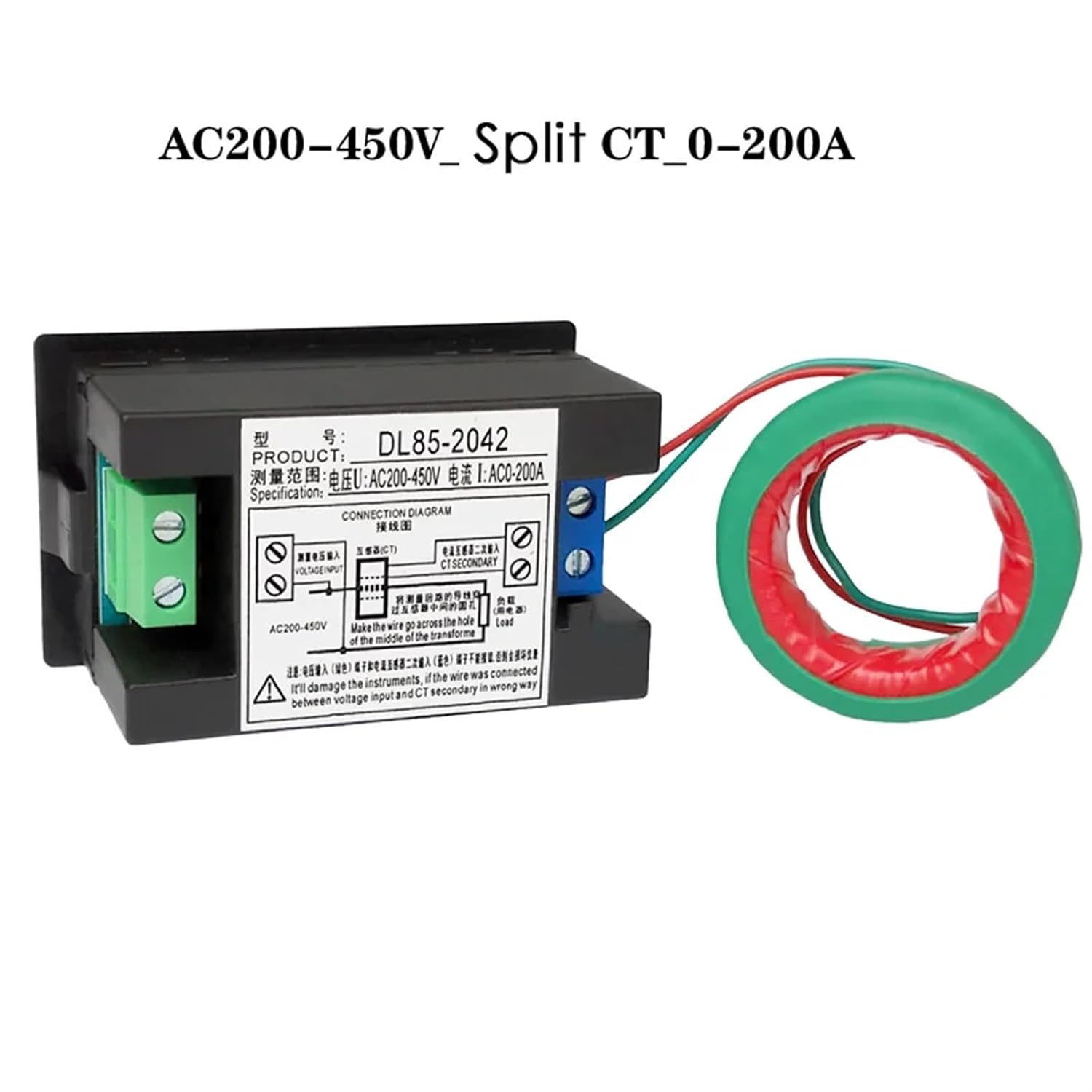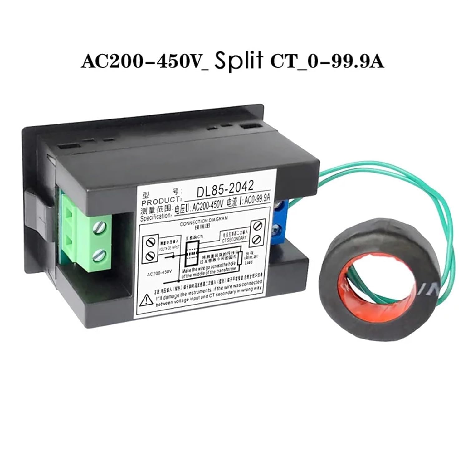 AmmetersSpecificationMeasuring range: AC voltage AC 80-300V 200-450V, AC current AC 0-50A 0-100A 1-200APower consumption: 0.2VAMeasuring speed: about 2 times per secondDimensions: 70 (length) * 40 (width / height) * 39 (depth) mmHole installation size: 68*38mm (embedded installation)Model Description:1: DL85-2041 type: the is fixed on the meter2: DL85-2042 type: the is separated from the meter, the can be installed according to the actual position of the measurement, and the secondary end lead of the can be lengthened by 0.5-3 meters without affecting the measurement accuracy.Package Included1× DL85-2041-2042