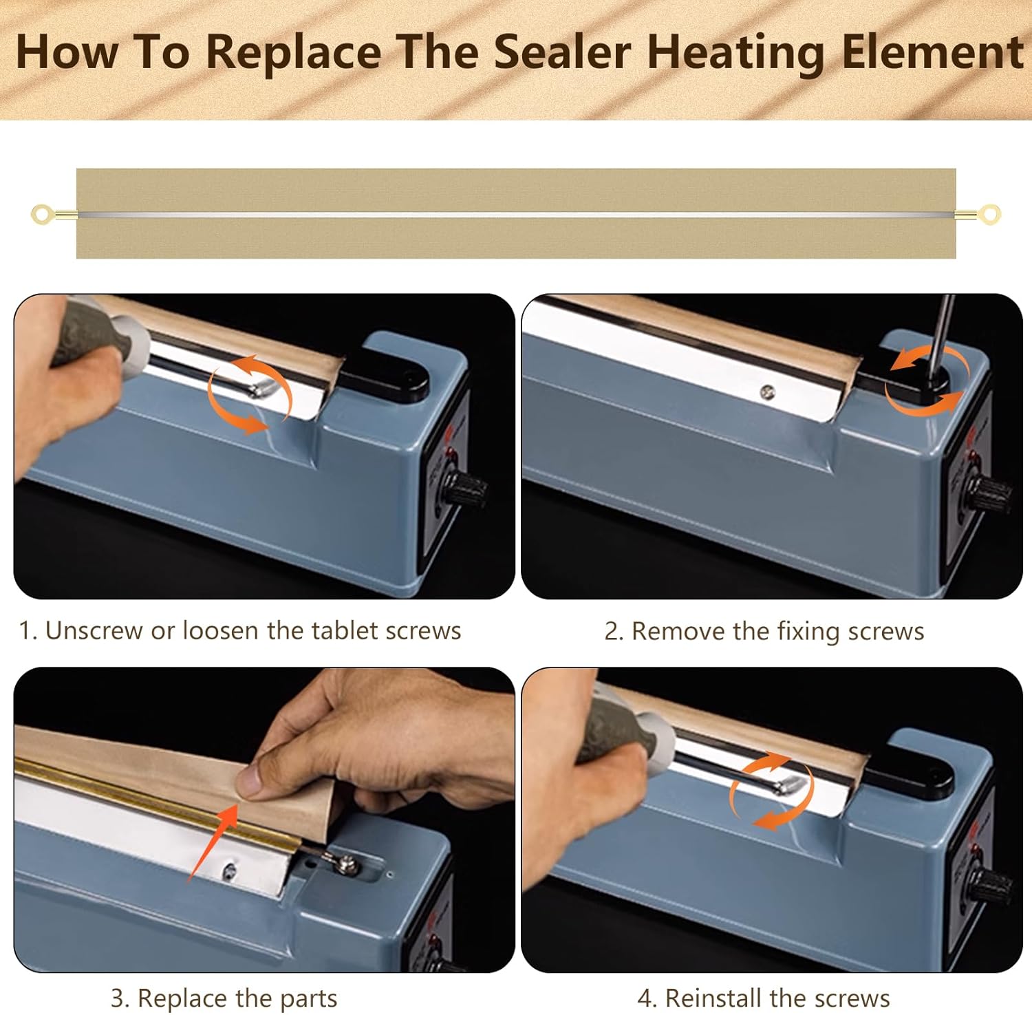 Impulse sealer heating element: - Suitable for most (but not all) impulse sealing machines that are marked "12-inch" machines or have "300" as part of their model number, please make sure that the size of your sealing machine is consistent with the product size. - Most machines require just a screwdriver for installation, often try to change the old kit for a better bag sealing experience. Kit should be replaced when the PTFE (cloth) is warning, changing color, or the seal effect is not good as before. Specifications: Material: chromium alloy Size: approx. 12 inches in length / 0.08 inches in width Package Contents: 10 x Impulse sealer heating element