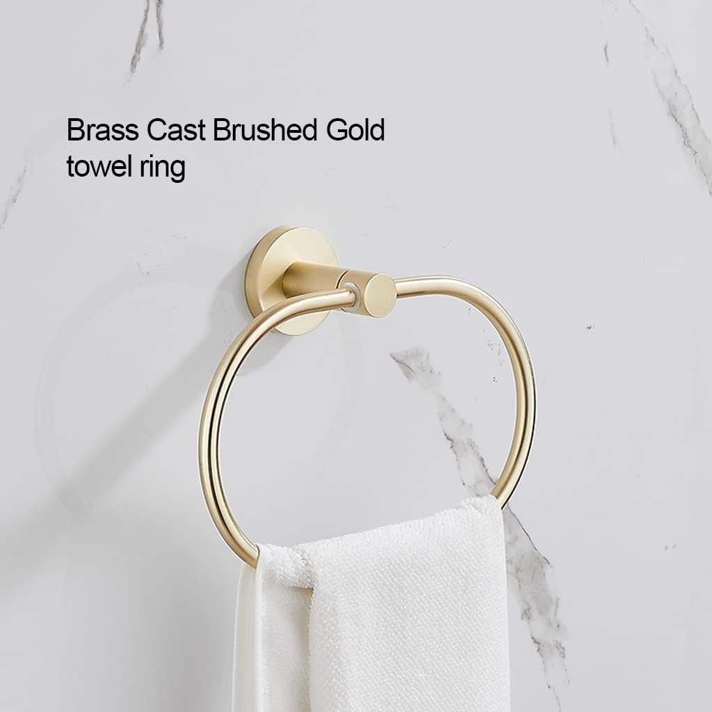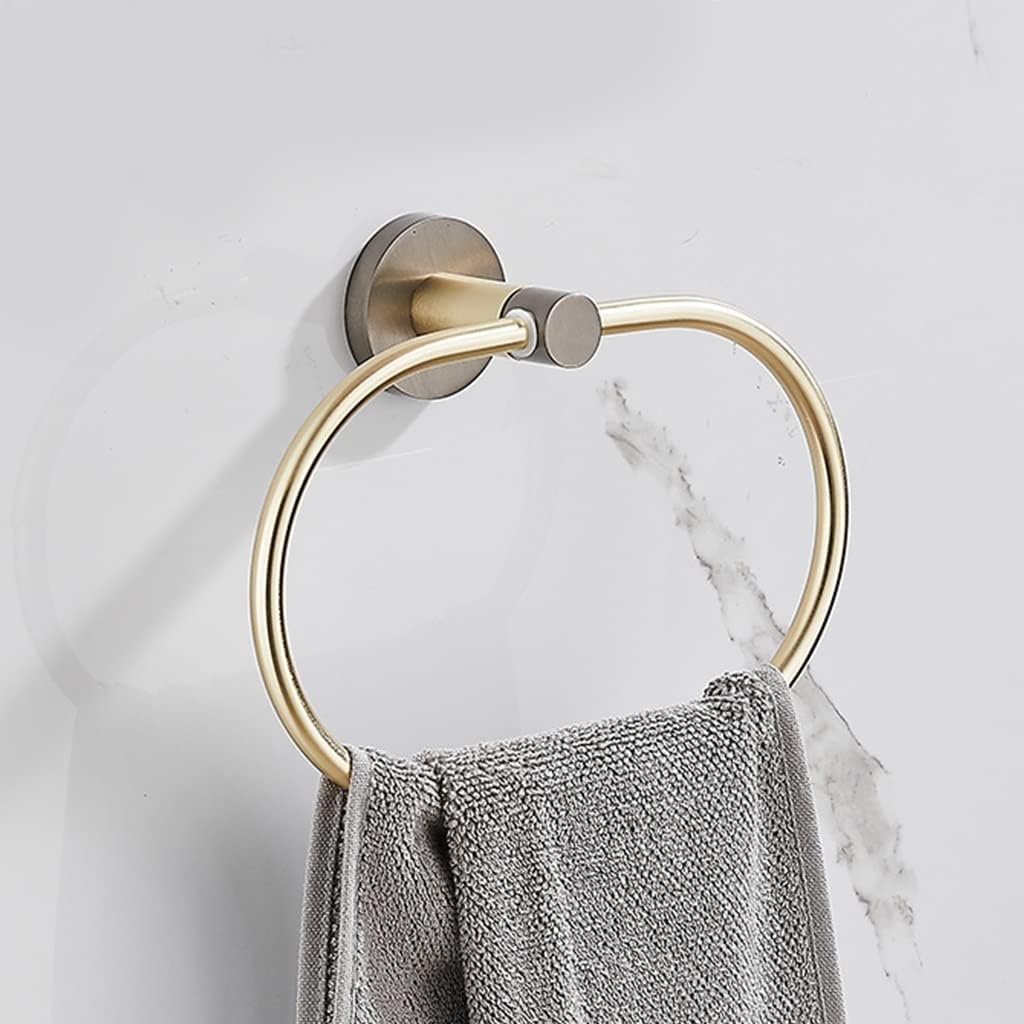 Brushed Gold Towel Ring, Bathroom Accessories, Bathroom Hand Towel Holder Round Towel Hanger>>Specations:>Material: all copper>style: >Installation method: perforated>shallow technology: copper wire drawing>>Package Includes: >1 x Towel Ring>>Note: >1. Light shooting and different displays may cause the color of the item in the picture a little different from the real thing. >2. The measurement allowed error is +/- 1-3cm.{/p}