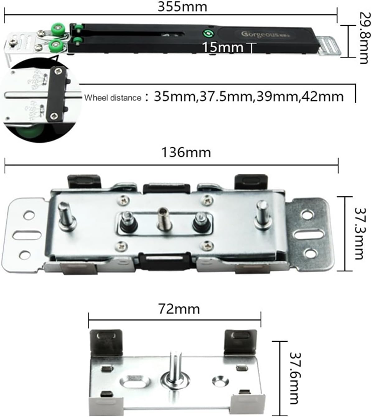 1.Soft-close push-open drawer slides are designed to push open quietly and smoothly and close automatically.2.The slides are smooth and durable, and easy to install.3.drawer slides feature a full-extension design that opens completely for easy access.ArgumentInstallation method: Top installationMaterial: galvanized steelWeight of door :15-30kgFeatures: damping buffer, mute mute, anti-fall offUse: Closet sliding doorPacking :1 pieceAttention:Unidirectional buffering requires 1 damperTwo-way buffering, two dampers required