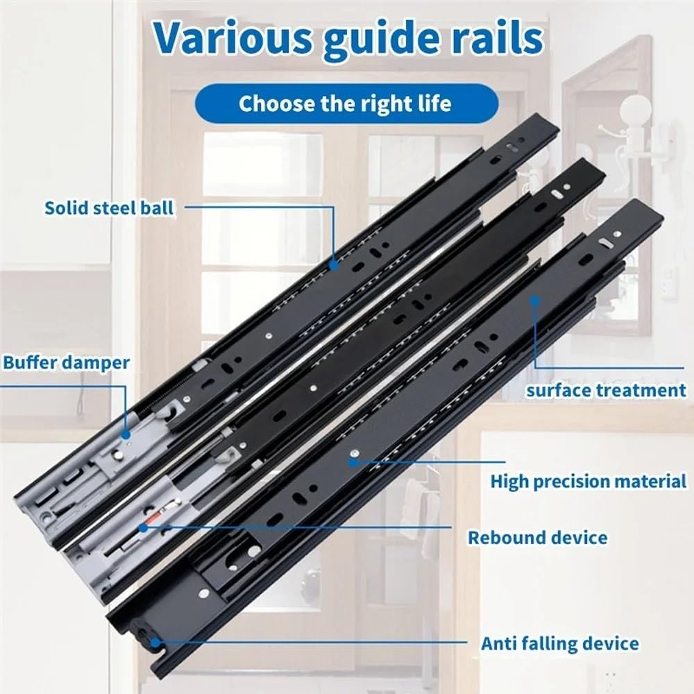 1. Concealed drawer slides give your drawers a clean and aesthetically pleasing look while maintaining practicality.2. We offer a variety of drawer slide sizes to meet different size and usage needs.3. Suitable for kitchens, studies, pantry, and other storage spaces.Name: drawer slide damping slideScope of application: drawer slides, office furniture, custom furnitureSpecifications: normal 10"/12"/14"/16"/18"/20"Material: cold rolled steelProcess: StampingPackage includes: 1set(2pcs)