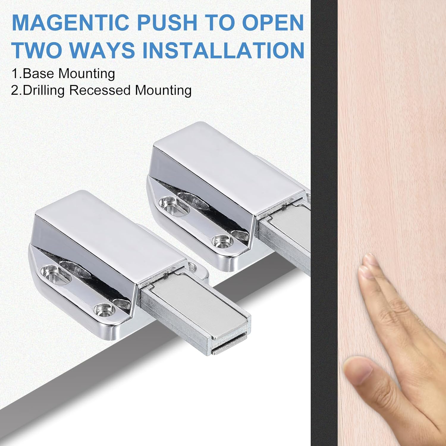 Description:Material: Made of Good-Quality base and durable spring mechanism ensures anti-rust and corrosion resistance, making it a timeless choice for medium-sized doors.Design: Our push to open system is designed with snaps at the tail and head of the base, which makes the latches more stable and not easy to fall off. Easy to Use: Built-in spring-loaded plunger, you can just simply press the door to latch. Eliminates the need for handles or knobs. Create the clean, seamless look of no knobs. Suitable for use with hinges without self-closing feature.Secure Closure: Our push to open system features a long-stroke design with a built-in magnet that ensures a secure close point, preventing "drifting open" doors. You can rotate the magnetic tip of the inner core left or right to adjust its extra extension length of 2-9 mm to fit the gap of the door.Specification:Color: SilverMaterial: MetalLength: 48 mm / 1.89 inchWidth: 40 mm / 1.57 inchHeight: 21/0.83 inchPackage included: 1 Pcs Magnetic Push Latches