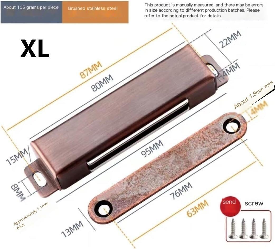 Each mount houses a single magnet with strong force that holds the cabinet door, drawer, lid securely closed. Good for using on the door which the latch is useless.Material: Stainless steel.Product packaging: boxScope of application: furniture cabinet door rebound handle magnetic touchPackage Includes:2x to Open Door Catches