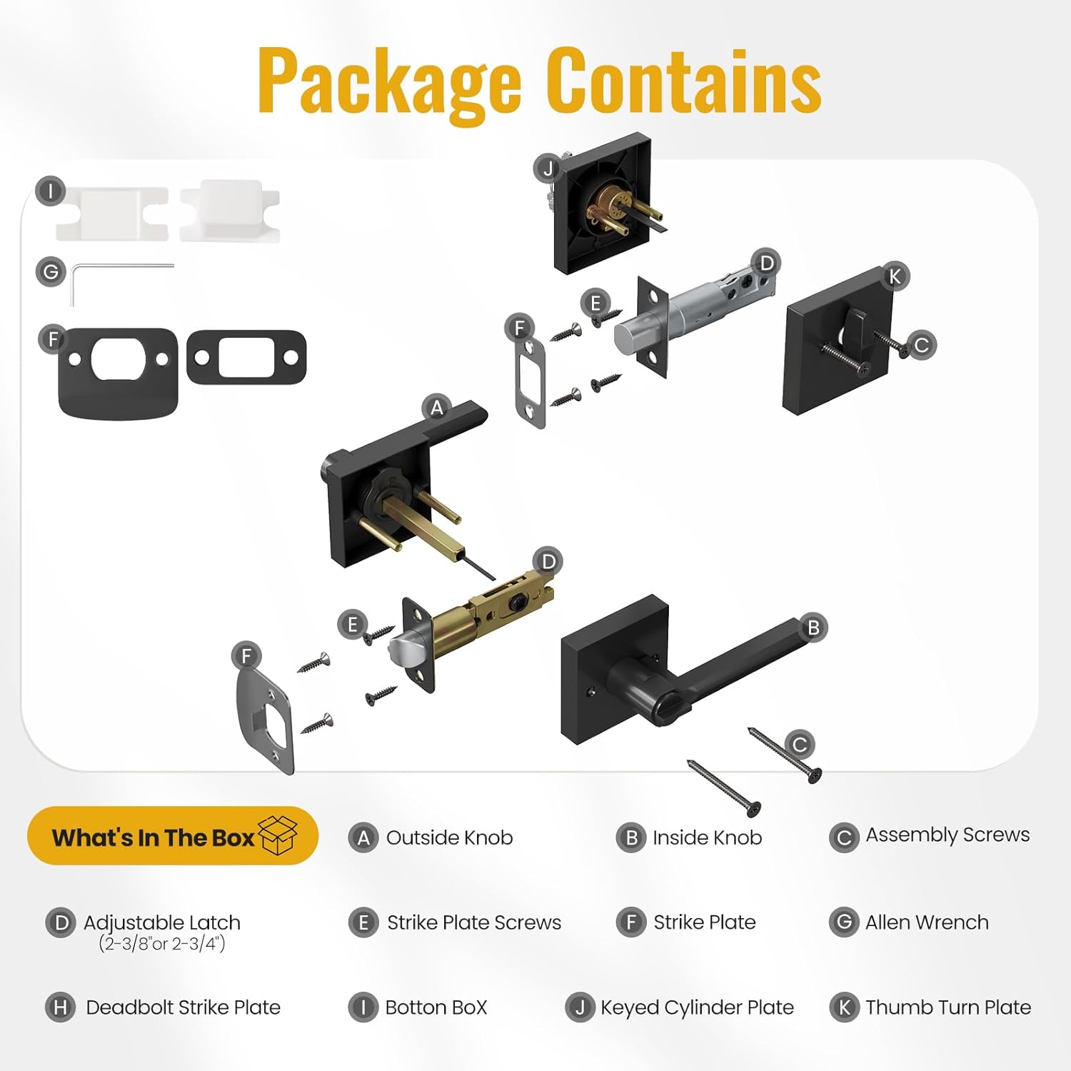| Included Components | Bolt, Deadbolt, Instruction Manual, Key, Knob, Latch, Lock, Screw |