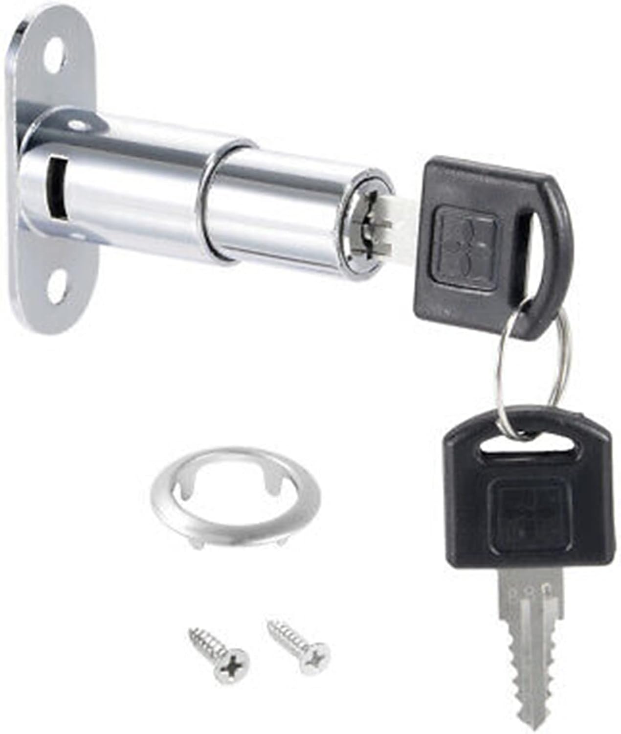 Locks for retailers Chrome Finish Plunger Lock Zinc Alloy Cylindrical 32mm x 19mm Keyed Alike 1 Set Description: cylinder length 32mm, cylinder diameter 19mm. The zinc alloy and chrome finish will resist wear and oxidation over time. Lock has same key, with key retention (key can be removed from lock from the closed and open position) Perfect for cabinets, drawers, showcases, etc. Comes with two keys, mounting screws are included.