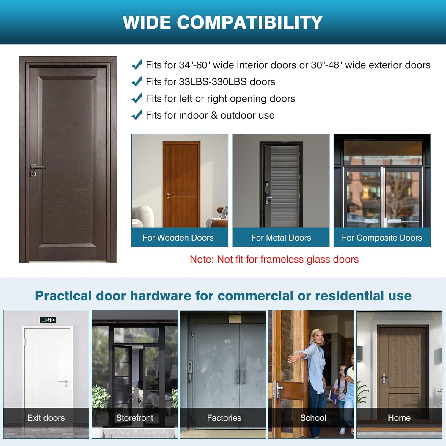 | Recommended Uses For Product | commercial doors, high-traffic entrances, doors weighing up to 330lbs and measuring up to 55.1'' in width, settings with strict safety and accessibility requirements |