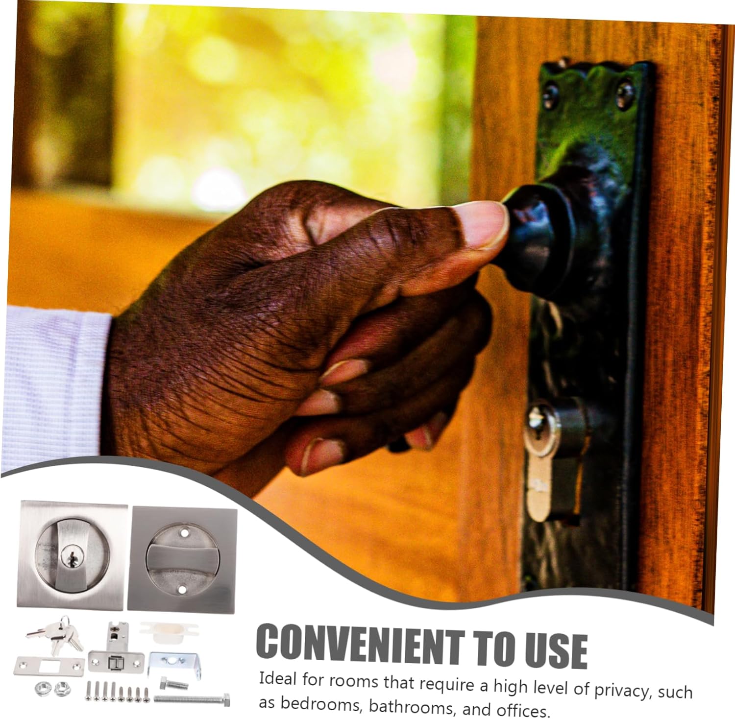 Package Include 1 x Set of Lock 1 x Hook 10 x Screws 3 x Keys 1 x Gasket 1 x Plastic Frame Characteristics -Color:Silver pocket door lock metal -Material:Zinc Alloy interior door lock -Size(hook):7.50X5.50X2.40cm/2.95X2.16X0.94in bathroom pocket door lock -Size(lock):6.50X6.50X0.20cm/2.55X2.55X0.08in door lock -Product Info:Pocket door lock -The privacy function of this hardware allows for safe use in special situations, providing an layer of security door locks with keys. -It is suitable for standard door thicknesses, making it compatible with a wide range of doors pocket door hardware with lock. -The wide knob design of the hardware ensures and rotation, making it convenient to use bedroom door lock with keys. -This hardware reuses the original circular door hole, avoiding any deformation or instability that may occur during installation door latch lock. -The construction of the privacy pocket door hardware with key pocket invisible door lock is stable and firm, ensuring its use internal door lock.Goods Descriptiondoor lock bolt Its unique thin embedded design ensures that it is from view, while its zinc alloy construction ensures that it is strong and durable.portable door lock for travelling This pocket door lock is the perfect solution for those who privacy and security.pocket door lock metal Its sleek and modern design is perfect for any room in your home, while its stable construction ensures that it will last for years to come.pocket door hardware with lock The lock is easy to install and requires minimal effort, making it a for DIY enthusiasts