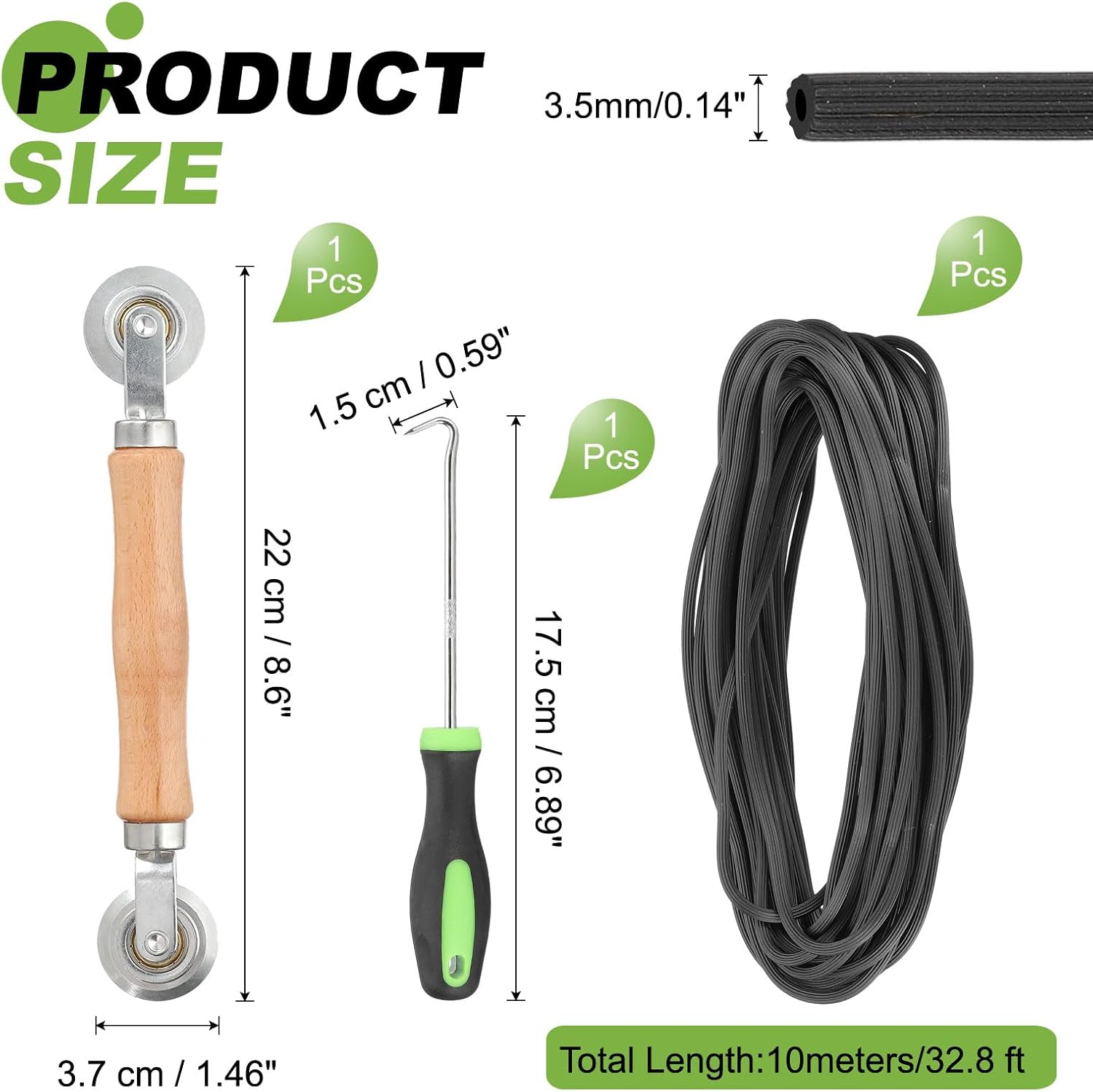 Description: Dimensions & Package - Material: TPE; Color: Black; Screen Seal Length: 10m/10m; Screen Seal Diameter: 3.5mm/0.14inch; Screen Roller Size: 22 x 3.7cm/8.66 x 1.46inch(L*Dia); Removal Hook Size: 17.5 x 1.5cm/6.89 x 0.59 inchinch(TTotal LengthLength*Hook Length); Package: 1 Piece x Screen Seal, 1 Piece x Screen Roller, 1 Piece x Removal Hook. Wide Application - The screen tool kit is versatile and suitable for all kinds of doors and windows that install screen nets, such as garden screens, patio screens, porch screens, doors and pool screens. HOW TO USE - The screen tool kit includes screen strips, screen rollers and removal hooks. You can cut the screen strips to the appropriate size, use the removal hook to pull out the old screen strips, and then use the roller to smoothly slide the seal and screen mesh into the groove of the window frame. Whether for installation or replacement, this kit can meet your needs. Note - To ensure the correct size, measure the width of the existing deflector in the screen frame before purchasing. During installation, avoid direct contact between rollers and net to avoid damage. Design - The screen strip is made of TPE material with a contoured and hollow design. It has excellent rigidity, durability and is resistant to aging. The roller tool has a solid wood handle and double ended rollers for easy use. The removal hook has a rubber handle with ergonomic shape for a comfortable grip, offering better grip and ease of use.