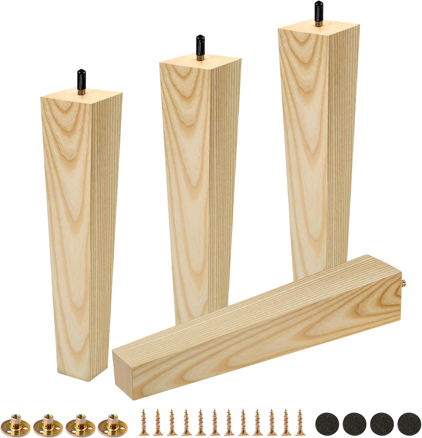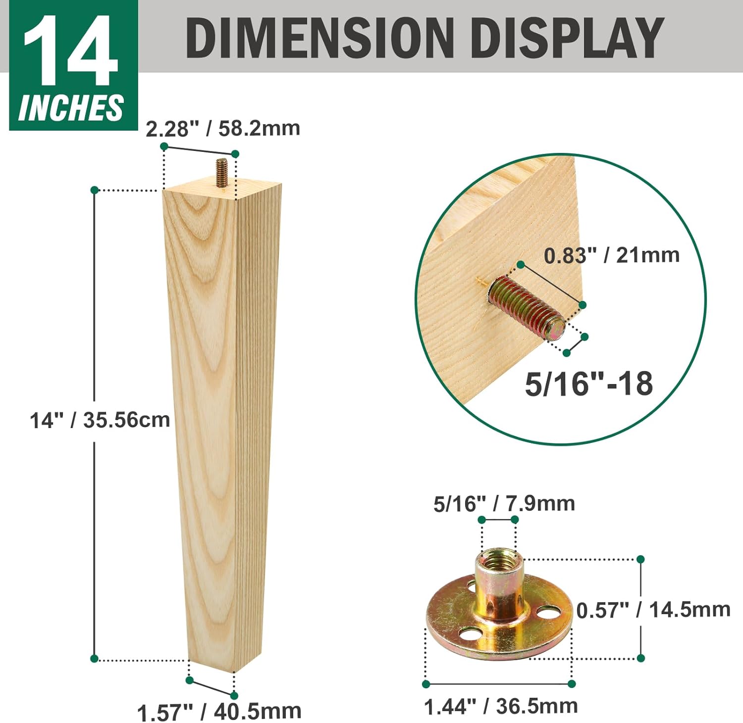 Features: Smooth edges without burr avoid pricking the hand for safety operating Rubber floor pads can protect your floors from marring and scuffs. Specification: Material: Solid Ash Wood Colour: Natural Colour Leg Type: Tapered Square Hanger Bolt: 5/16" / 7.94mm The height for wood part: 14" / 35.56cm Each Leg Weight Capacity: Approx.300lbs / 135kg Package Content: 4 x Wood Furniture Legs 4 x Rubber Floor Pads 12 x Mounting Screws 4 x T-Nut Warm Tips: 1.Due to manual measurement, please allow 1-2mm difference between actual and manual measurement size. 2.The pictures are taken in kind, and the pictures are as consistent as possible with the real objects, but the colors are slightly different due to equipment, lighting, display and other reasons.
