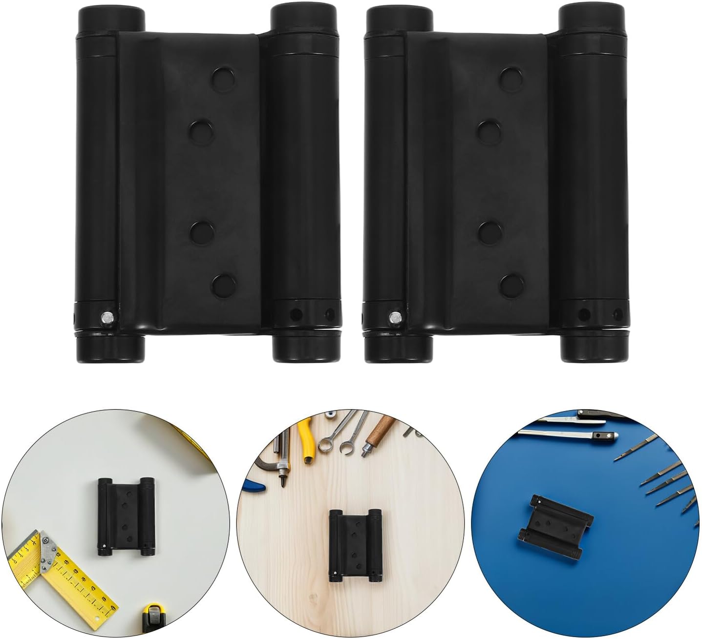 Package Include 4 x Hinge 32 x screw 1 x wrench Characteristics -Robust rustproof material: made with stainless steel, these hinges stainless steel resist corrosion, making them perfect as exterior door hinges for homes and businesses needing reliable hardware -Product Info: Double self-closing door hinge -Wide application compatibility: whether you need heavy duty hinges for wood doors or stainless steel door hinges for metal doors, this set adapts to various door types, fitting garage doors, gates, or bars hinges self closing for home - Size: 9.20X6.80X2.20cm/3.62X2.67X0.86in -Convenient automatic closing: auto close door hinges feature a double spring hinge that eliminates the need for manual closing, ensuring doors selfclose smoothly in busy cafes, salons, or commercial spaces double opening spring hinge - Size: 2.50X0.80X0.80cm/0.98X0.31X0.31in -Material:Stainless steel - Color: Black -Smooth silent operation: these door hinges provide quiet and comfortable use, preventing door slams in residential and commercial settings spring hingeGoods Descriptionself closing hinges This robust spring hinge fits doors, café doors, and heavy wood swing doors, bringing quiet operation and secure performance.auto close door hinge The stainless steel construction makes sure durability, making these door hinges stainless steel a choice for high-traffic areas needing stable and efficient solutions.door closer hinge Upgrade your door hardware with stainless steel self closing hinges designed for automatic door closure in commercial or residential settings