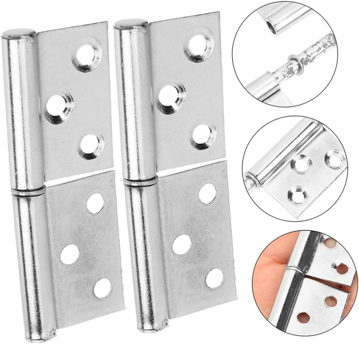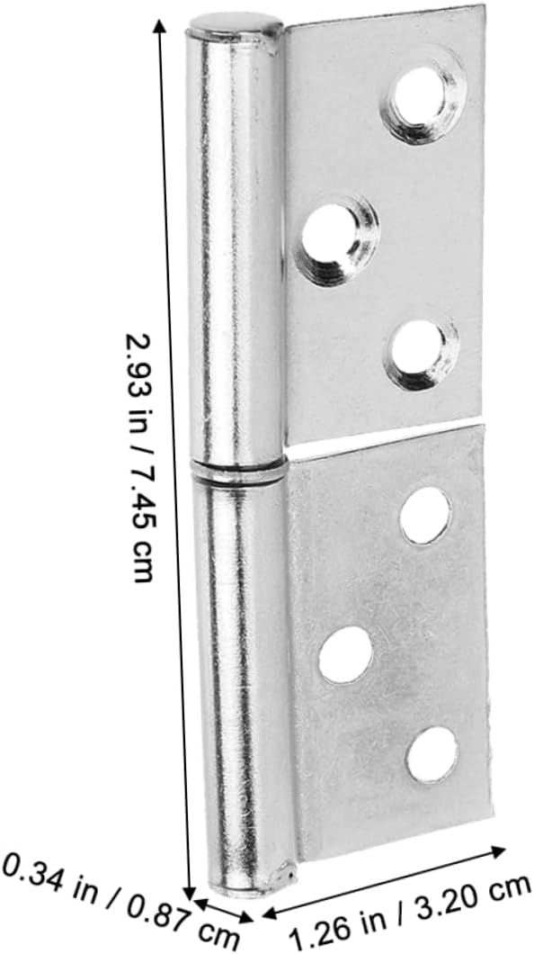 Package Include 24 x Hinges Characteristics -Color:Silver -Size:7.45X3.20X0.87cm/2.93X1.26X0 hidden door latch. -Material:Stainless steel door lift hinges -The heavy-duty construction of this hinge ensures reliable performance in any settings small hinges. -The flat hinge features convenient opening or closing of doors and windows small hinges for wood. -The stainless steel material used in this hinge ensures resistance to break and tear gate latch hinges. -The detachable design of this hinge allows for quick installation and maintenance hinges outdoor. -The lift off hinges can be used in doors, windows, cabinets, wardrobes, and more. Versatile application small hinges for window.Goods Descriptionshutter hinges Allows for easy installation, making it a practical choice for any setting.corral gates hinge Its stainless steel material is resistant to break, ensuring long-lasting performance.hinges for fence gates This hinge is for doors and windows, with a strong load-bearing capacity that can withstand heavy use