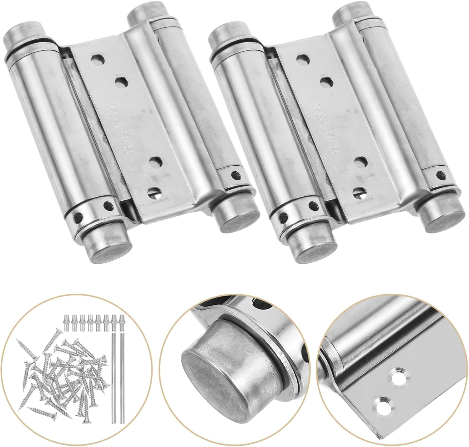 Package List 4 x Hinges 32 x screws Features -Versatile usage: these hinges are ideal for both interior and exterior doors, making them a versatile addition to any home or business soft close hinges for cabinet doors -Adjustable functionality: the freeswinging feature allows you to adjust the door's opening and closing angle, providing adjustable functionality spring loaded hinges - stainless steel: made from stainless steel, these hinges are built to withstand daily use and harsh conditions, ensuring durability spring door hinge. -Material:Stainless steel hinges -Size:12.00X7.50X1.50cm/4.72X2.95X0.59in heavy duty door hinges -Effortless installation: designed for straightforward installation, these hinges are suitable for both DIY enthusiasts and professional installers self closing door hinges -Color:Silver hinges heavy duty -Automatic door closing: the double spring design ensures that doors close automatically, offering added convenience and security hinges small.Goods Descriptionstainless steel door hinges Easy to install, these hinges come with all necessary hardware for a simple setup. hinge They are designed to fit standard door sizes and can be used on both new installations and replacements.stainless steel hinges The self-closing feature enhances security by ensuring doors are never left ajar, making them suitable for use in homes, schools, and commercial buildings