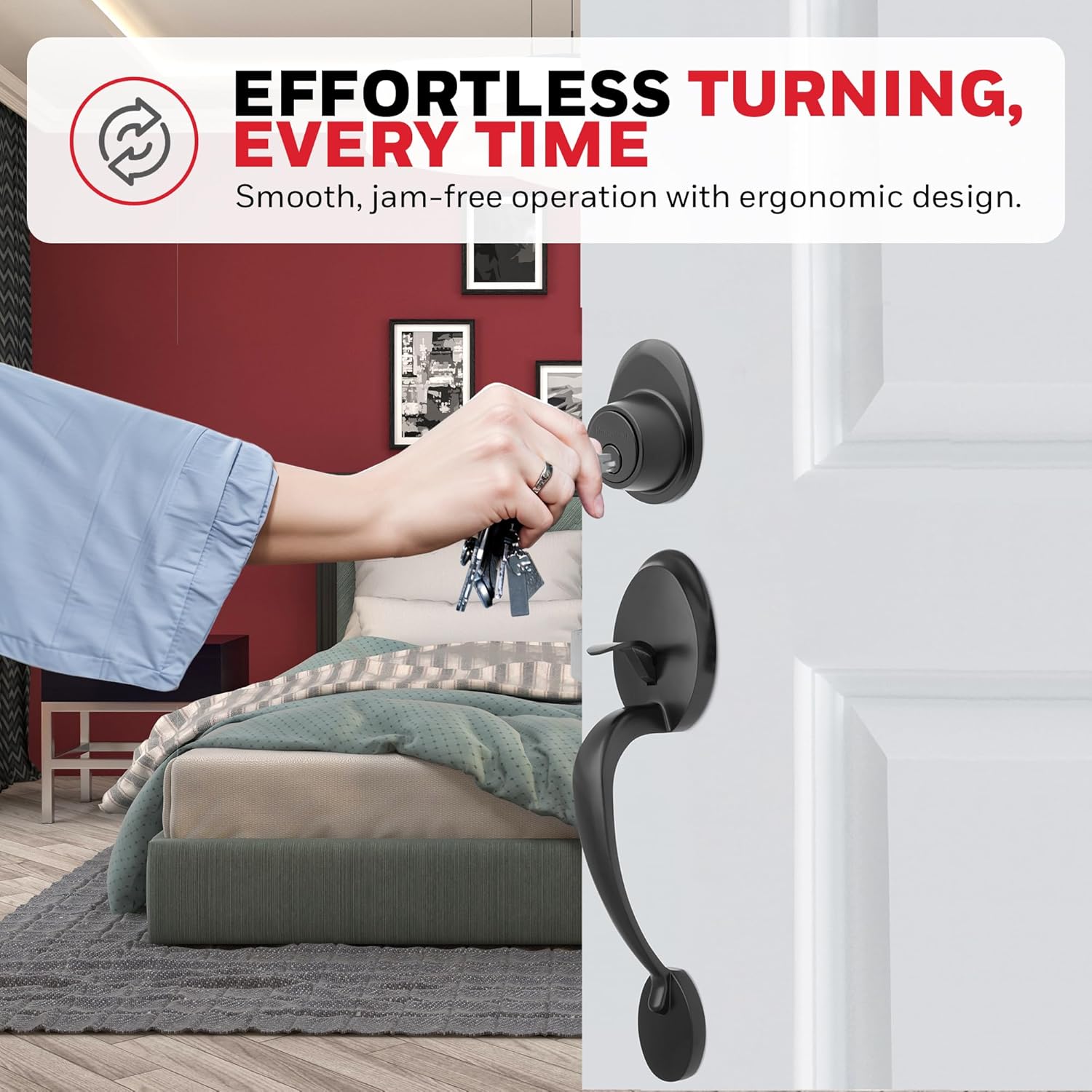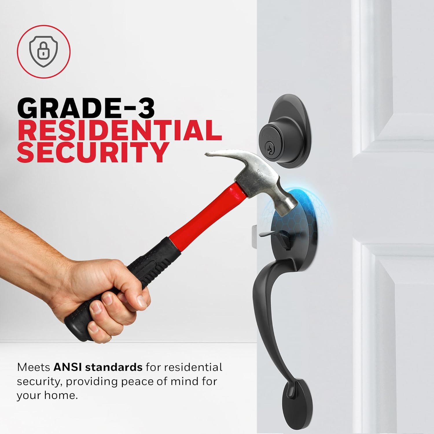 Upgrade your entryway with the Honeywell Safes & Door Locks Matte Black Front Entry Handleset with Single Cylinder Deadbolt, a perfect blend of style, security, and functionality. Featuring a sleek matte black finish and a curved lever, this handleset adds a modern and sophisticated touch to any home or office decor. Designed to enhance the aesthetic of your space, it provides a seamless combination of elegance and practicality. This handleset is easy to install, thanks to its reversible design and detailed instructions, making it suitable for both beginners and experts. It fits standard doors, ensuring a hassle-free installation process and a perfect fit. The single cylinder deadbolt offers robust protection, delivering reliable security for your home or office. Its sturdy design ensures peace of mind while maintaining a stylish appearance. Built with high-quality materials, this handleset is crafted to withstand daily wear and tear, ensuring long-lasting durability and reliable performance. It is designed to endure even harsh weather conditions, making it an ideal choice for both interior and exterior doors. The versatile lever and deadbolt combo work seamlessly with left- or right-handed doors, providing flexibility and comfort for a wide range of applications. Combining functionality with timeless design, the Honeywell Matte Black Front Entry Handleset is a practical and stylish addition to any space. Whether you’re upgrading your home or enhancing the look of your office, this product offers unmatched durability, security, and sophistication.