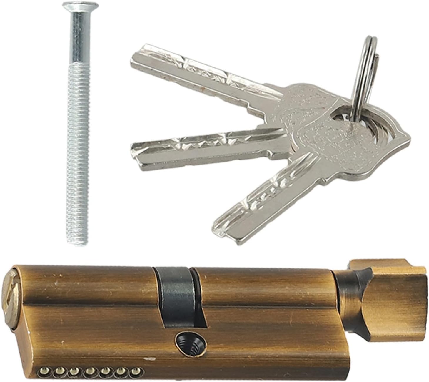 Product description Features:【Same Key for access】The door lock cylinder is designed with the same key for access, allowing convenience and efficiency.【 Aluminum Alloy】Made of aluminum alloy material, the lock cylinder ensures long-lasting performance. It features a 6-pin cylinder for added security.【Multiple Keys Included】Each lock cylinder comes with 3 keys and includes a set screw for easy installation. You will have spares and options for different family members.【Flexible 】The lock cylinder offers both side button and side button with a thumb turn option. This allows for easy and convenient use.【Quick Replacement/Installation】With thumb-turn European cylinders, the lock cylinder can be replaced or installed in just minutes, saving you time and effort. Specifications:*Product Name: Door Lock Cylinder *Material: Aluminum alloy*Size: 70mm *Color:gold, black, yellow bronze Package Content: 1 x lock cylinder3 x keys1 x screw Manufacturer Contact Information no
