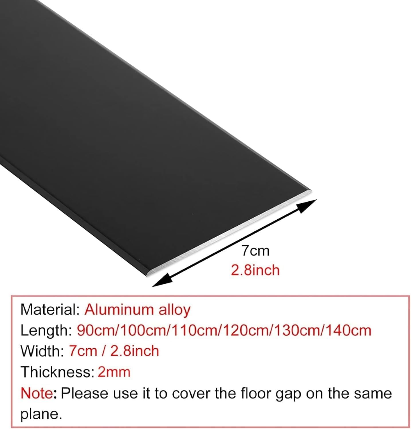SpecificationsMaterial: AluminumLength: 90 cm/35 ",100 cm/39",110 cm/43 ",120 cm/47",130 cm/51 ",140 cm/55"Width: 7 cm (2.8in)Tape thickness: 2 mm (0.08in)Weight capacity: 300 kg/660 lbsInstallation method: Super GlueCan be cut: YesSize: CustomizableFeaturesAluminum for long lifeAnodized aluminum finish clean to the touchCan be cut and easy to cleanQuick and easy installationCan make door of strollers/wheelchair or sweeping robot better passDIY decoration- tea for living room,kitchen,bedroom.Package includes:1 × transition stripNoteThere may be 1-2 cm errors in the manual measurement,please refer to the actual Product. (0.39 inch = 1 cm)