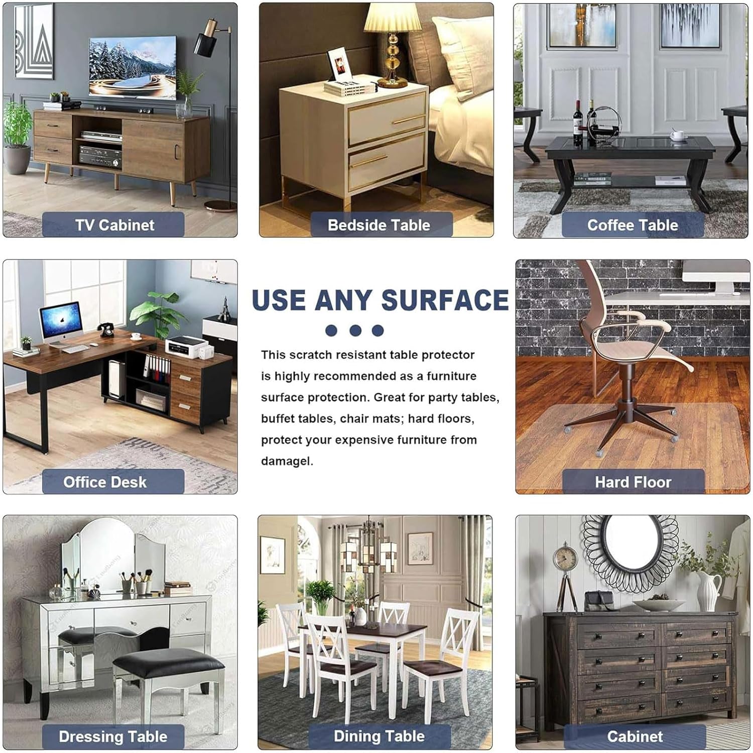 | Recommended Uses For Product | Dining Table, Desk, Center Table, End Table, Card Table, Nightstand, Coffee Table, Buffet Table, Kitchen Countertop, TV Stand, Dresser, Hard Floor Protector |