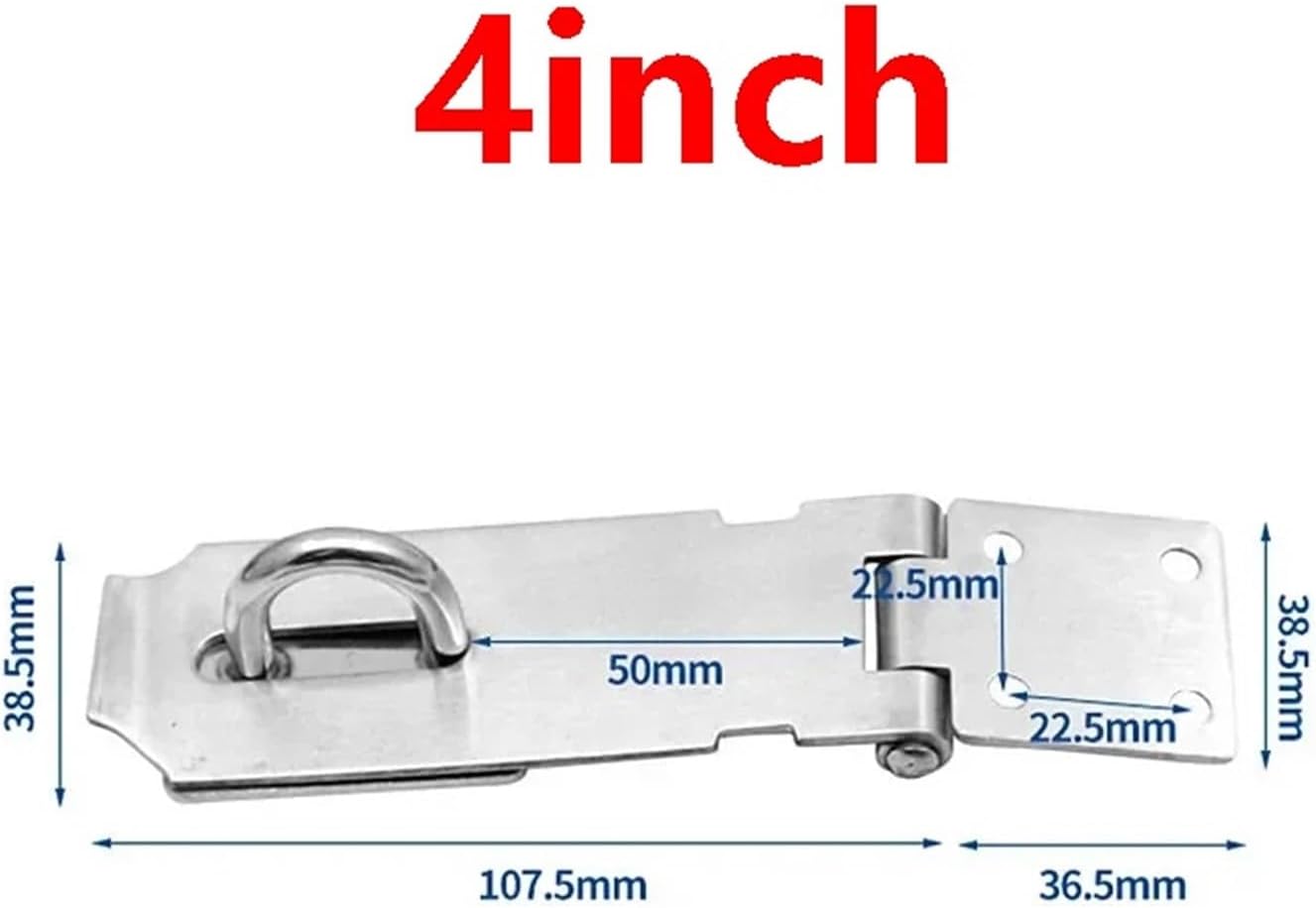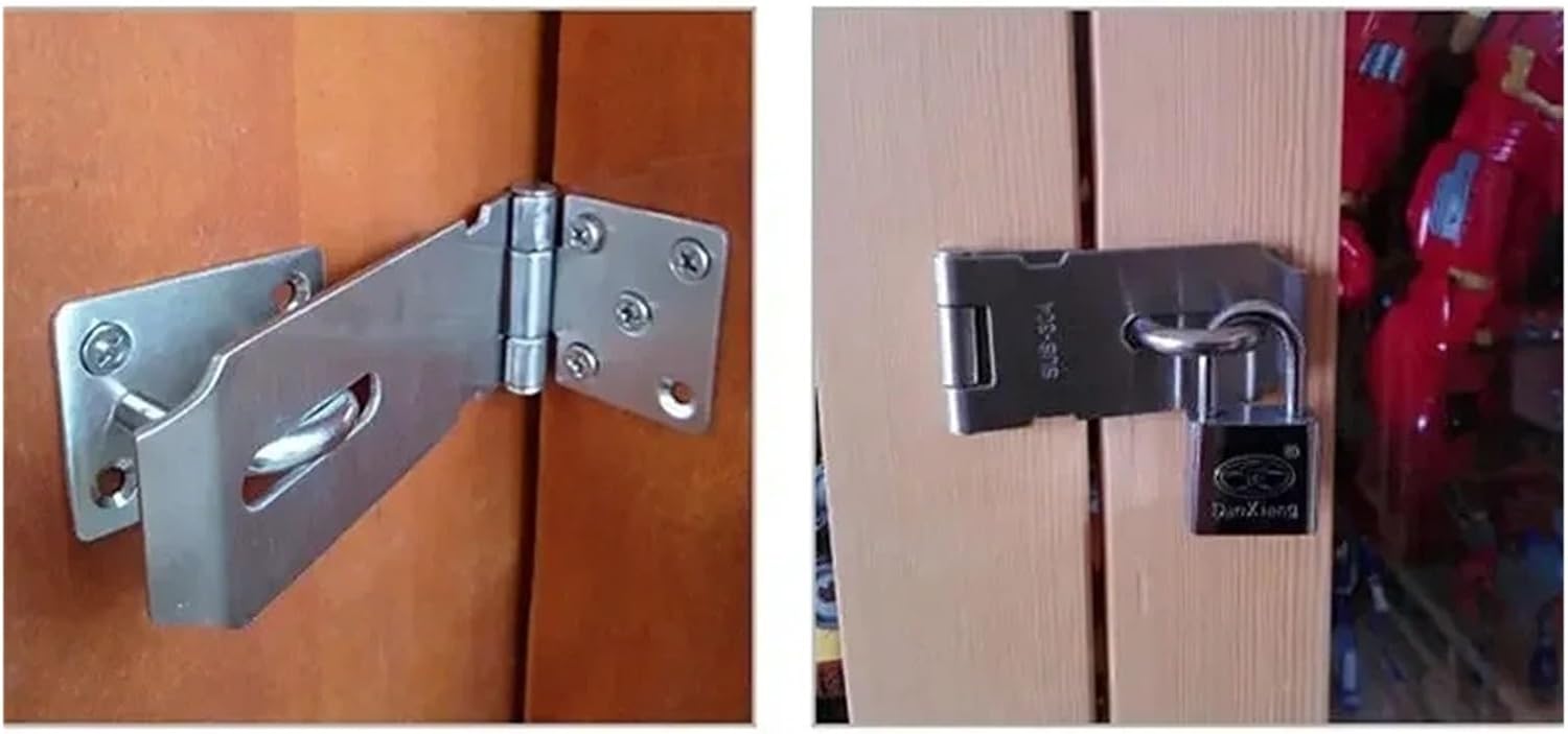 Specification:* Product: Door hasp* Material: Stainless steel* Color: Silver* Scope of application: doors, cabinets, boxes, drawers, etc.* Size: 3/4/5 inchPackage Included:1 x Door hasp with ScrewsNote:Please allow minor deviation due to manual measurement.Due to the difference between different monitors, the picture may not reflect the actual color of the item.
