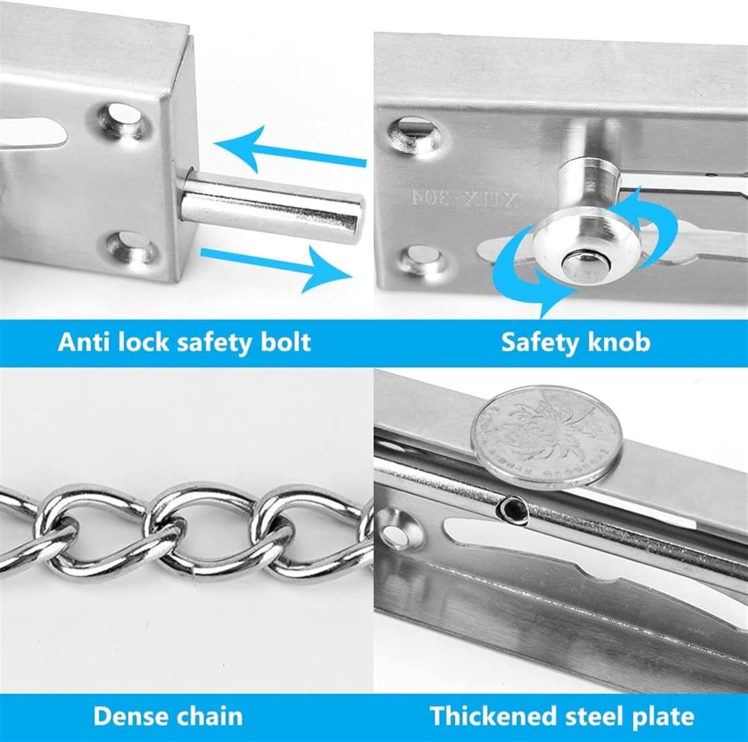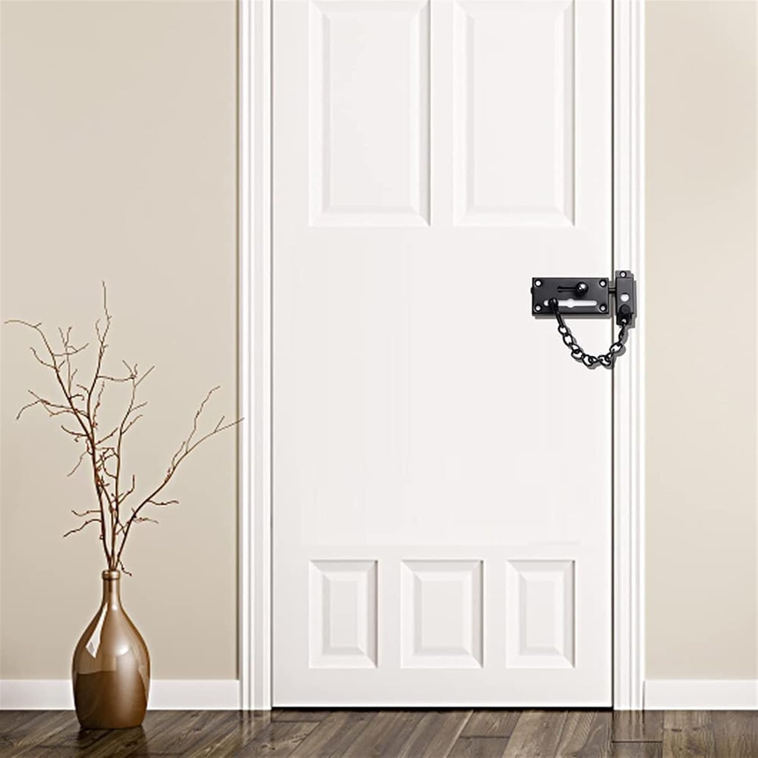 Product Features:1. The anti-theft door chain allows you to identify the caller after opening the door and prevent them from entering.2. The door lock can only be opened from the inside but not from the outside to ensure your safety.3. The door lock can have a variety of installation methods, which can be installed according to your actual situation.4. Please measure whether the door frame has enough space for installation before buying.Specifications:Material: Stainless SteelSize: As ShownColor: Black/SilverPackage Included:1 x Door Chain LockIf you have any questions, please feel free to consult our customer service