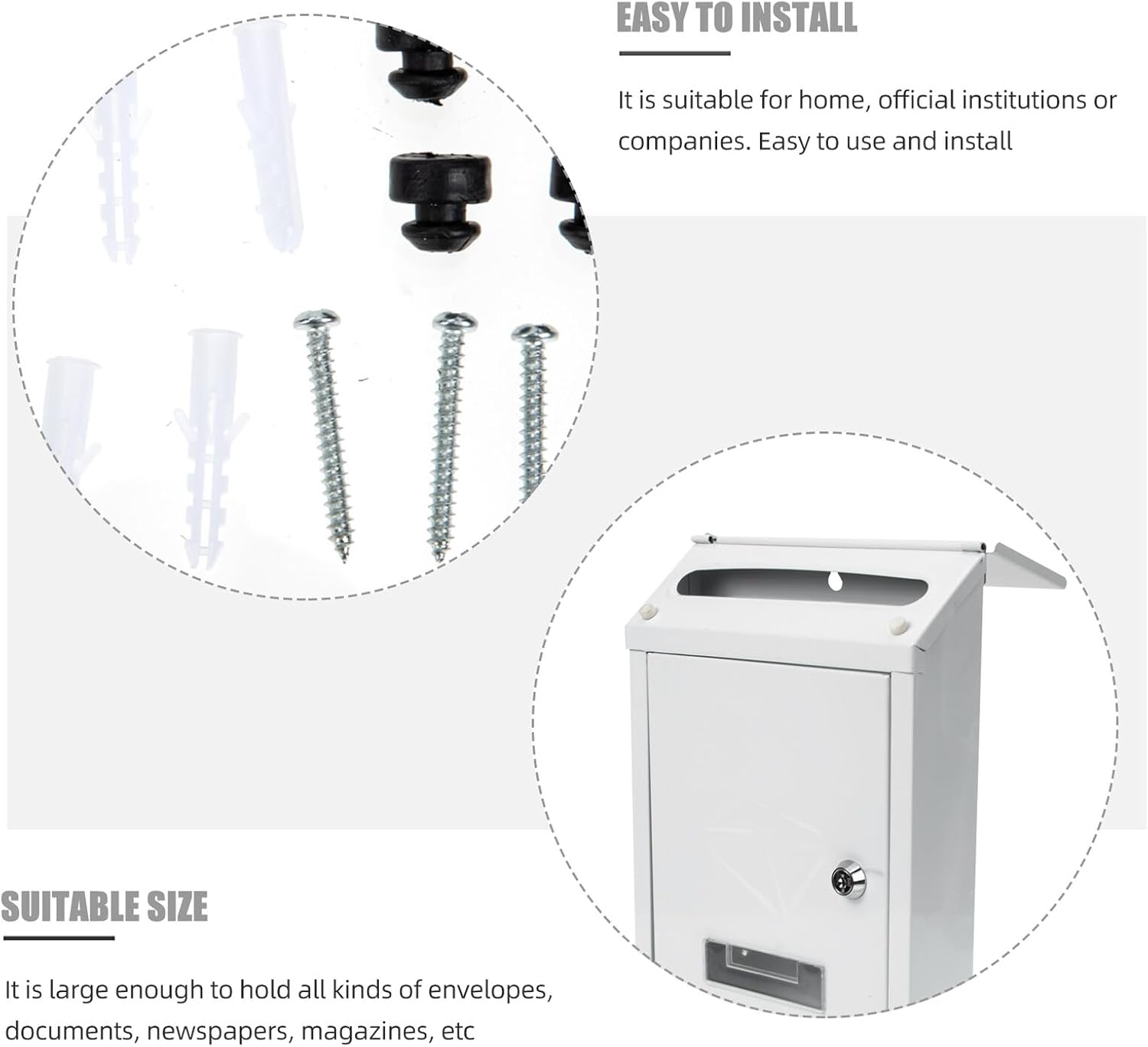 Package List 1 x mailbox with key Features - Color: White - Material: Iron -Product Info:Wall-mounted mailbox - Size: About 30.00X21.70X7.00cm/11.79X8.53X2.75in - Vintage style design, it can bring your home a new look outside mailboxes. - Appropriate capacity for storing files, newspaper, letter of complaint, cards and so on wall mailboxes outside home. - Lock design, help prevent your important mail from being destroyed, stolen or replaced mail boxes. - This letter box is very easy and convenient to install, giving you much convenience wall mailboxes for outside. - It is well-made of premium and sturdy materials, safe and practical for using time.Goods Informationmail boxes for house outside Selected iron material and workmanship that can ensure its durability and practicability.wall mailbox With wide applicable occasions and retro style, it is perfect for using as interoffice mailbox, small parcels box, suggestions box and so on