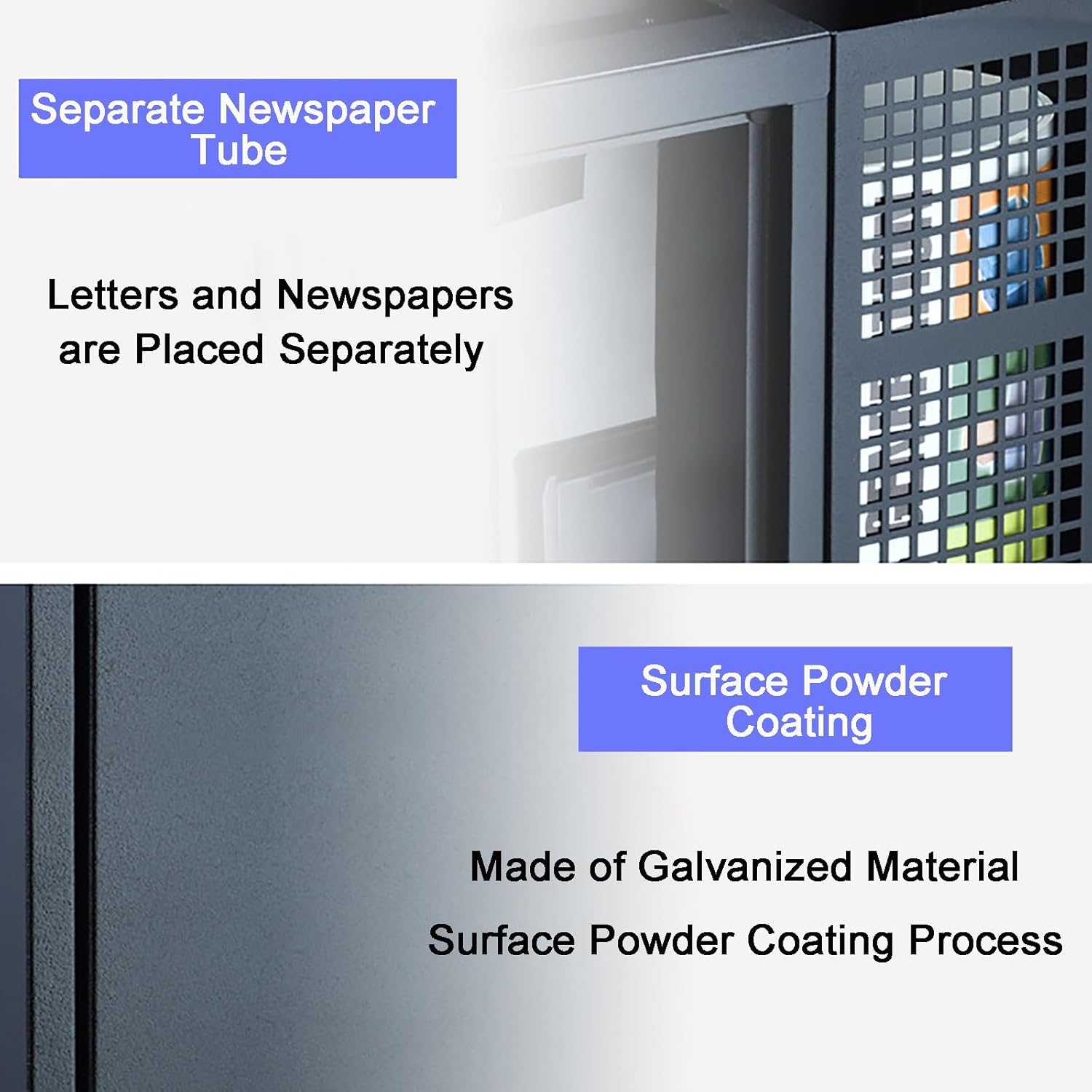 Zxhrybh mailbox is designed to complement the aesthetic of your home. Its modern, elegant, and sophisticated design makes it stand out among all the modern mailboxes for outside.Material:Galvanized steelColor:Black/WhiteProduct Size: 14.5x4.7x12.9in/37x12x33cmFeatures:1.Surface powder coating, galvanized material, reduce the risk of rust2.Noise-absorbing pad design reduces the noise from bothering you3.Safety lock, not easy to be taken by others, enjoy the privacy4.Separate newspaper tube, letters and newspapers are put in separately and sortedWall mount mailbox is made of high-quality galvanized sheet, which is built to last, sturdy, rust-resistant, weatherproof, and offers a longer service life. It features a smooth finish and looks very modern. It would be a great choice to mount it on any wall in the house or to display it outside