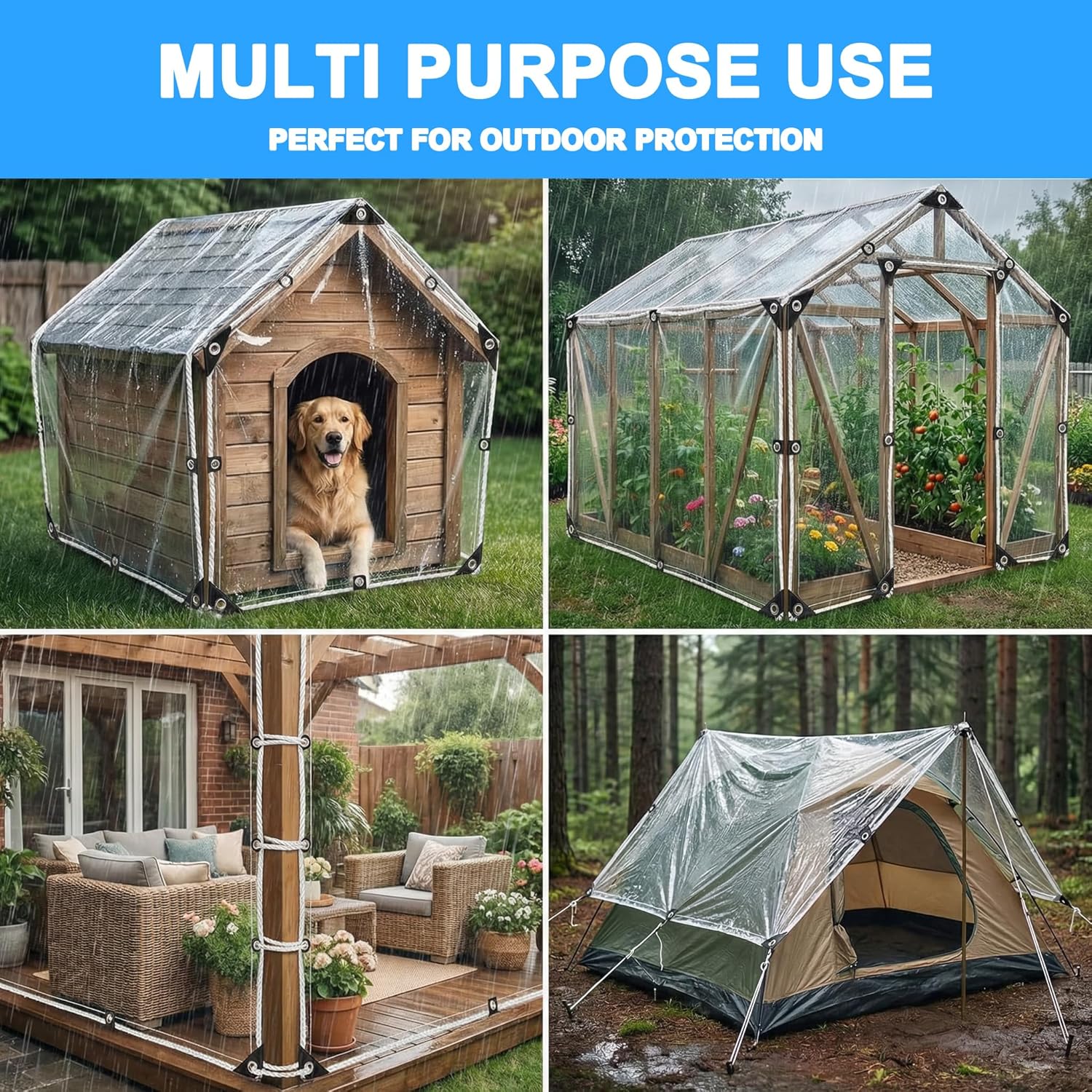 Premium Clear Tarpaulin for Reliable Outdoor Protection The GPtzlei Heavy Duty Clear Tarpaulin is designed to provide powerful outdoor protection while maintaining excellent visibility and natural light. Made from thick 240GSM transparent PVC, this tarp offers superior durability and long-lasting performance. Unlike ordinary tarps, this heavy duty clear tarp features reinforced edges and rust-resistant grommets, ensuring strong resistance to tearing and harsh weather conditions. Built for All Weather Conditions This waterproof and UV resistant clear tarp protects against rain, wind, snow, and sun exposure, making it perfect for year-round outdoor use. Perfect for Multiple Outdoor Uses This versatile transparent tarp cover is ideal for: Patio enclosures Pergola covers Greenhouse protection Dog Houses covers Garden furniture protection Camping shelters Complete Installation Kit Included To make installation easier, the tarp comes with: 5m durable rope x 2 10 bungee cords x 2 22 fixing straps x 2 convenient storage bag This all-in-one installation kit allows quick and secure setup anywhere.