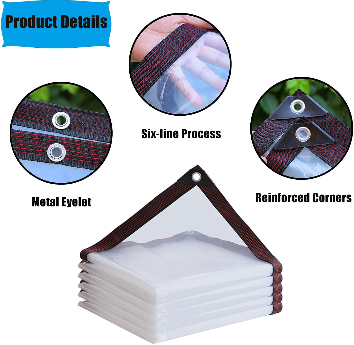 Our transparent waterproof tarpaulin can help you! This house tarp is waterproof and transparent, suitable for various places, foldable and easy to carry. Product Details: Product Name: Transparent Waterproof Tarpaulin Material: PE Color: transparent Thickness: 0.12 mm Weight: 120 g/m² Eyelets Pitch: 1 m ( 39.3 Inch) Transparency: 99% Package content: 1 x tarpaulin 1X Rope Main Features: 1.Waterproof PE material with solid fabric trim to ensure durability for extended use 2.Comes with metal grommets on the corners for easy installation 3.Flexible waterproof material allows for easy cleaning and storage after use 4.High- definition transparency, does not block the line of sight at all Note 1.Due to the need to heat seal and strengthen the edges, the actual size of the finished product is 3-5 cm smaller than the size you purchased. 2.Due to the shooting, light, display effect and other factors, there will be some color difference inevitably. 3. When not in use, please fold it up and store it properly. Do not over-stretch the edges to secure. 4. This clear tarps features anti-aging properties, making it suitable for long-term outdoor use.