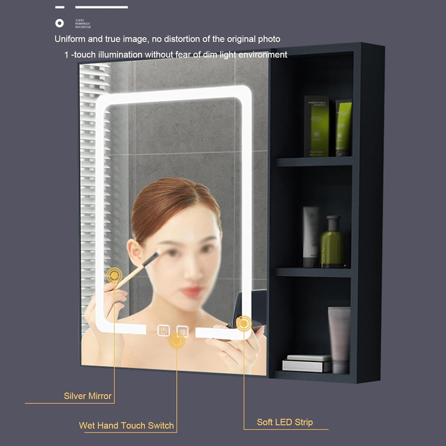 This bathroom mirror cabinet can be mounted on the wall or above the toilet, providing you with additional storage space without taking up valuable floor space.Upgraded silent hinges for more comfortable sleep at night. 304 stainless steel material is rustproof, giving your family a good sleeping environment.Product Name: Bathroom Mirror CabinetStyle: beautiful and practicalShape: squareProduct Color: Multi-colorSize:55x65 centimetre (21.7x25.6")75x65 centimetre(29.5x25.6")Product list: bathroom mirror cabinet x1 (other items in the picture are not included)Attention Tips:1.Product pictures are all physical photos, but due to the shooting technology, monitor parameters factors, there may be a slight color difference, please understand.2.The products are hand-measured, size error 1-3 centimeters error, please understand.