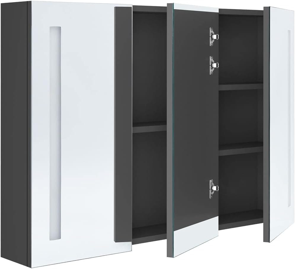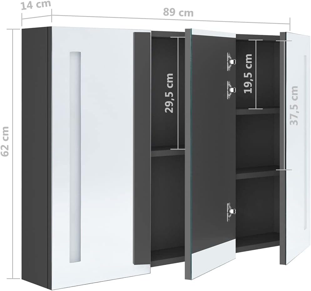 With our LED mirror cabinet, you give your bathroom an aesthetically appealing touch. Our LED wall cabinet brings a touch of modern style and soft light to any room! Made of high-quality MDF with melamine coating, the cabinet is designed to last. Thanks to the two energy-efficient LED light strips, you can put yourself in the best light, whether for make-up, shaving or skin care. The room, your face and your smile are always optimally illuminated. Inside there are 3 shelves that provide ample storage space for toiletries and beauty products. The light can be easily switched on and off via the bottom button. This stylish and functional cabinet will certainly make your interior design extraordinary. The cabinet can be easily attached to the wall. Note: The product has a USB port, but the certified 5V USB power source is not included. Colour: grey. Material: MDF with melamine coating, glass mirror. Dimensions: 89 x 14 x 62 cm (W x D x H). Cable length: 1 m. Includes 3 doors With 5 inner shelves for toiletries and makeup accessories On/off switch on the bottom. Max. Load capacity (total): 10 kg. Max. Load capacity (large compartment): 5 kg. Max. Load capacity (small compartment): 2.5 kg. Please note that you may only use a certified DC 5V input. Higher voltages can lead to overheating and damage the device as well as risk of overheating and fire.