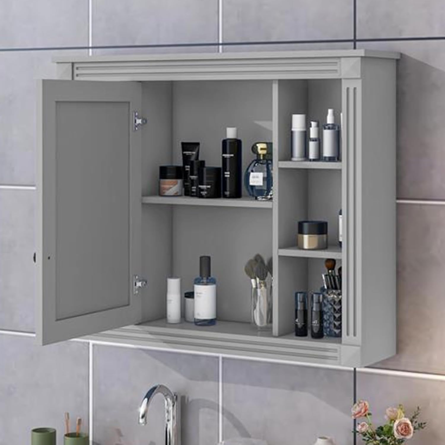 Product Name: Bathroom Mirror CabinetMaterial: woodColour: GraySize: 35x28.7‘’ Product list: bathroom mirror cabinet x1, installation accessories (excluding other items in the picture)Attention Tips:Product images are physical photos, but due to shooting technology, monitor parameters and other reasons, there may be a slight colour differenceProducts are hand-measured, there are errors in size